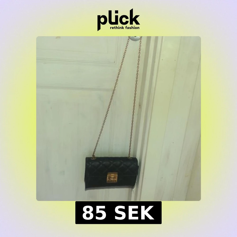 Säljer en svart quiltad axelväska med guldfärgad kedja och låsdetalj framtill. Väskan har en klassisk rektangulär form och är perfekt för att bära det viktigaste. Kedjan ger en snygg kontrast mot det svarta materialet.