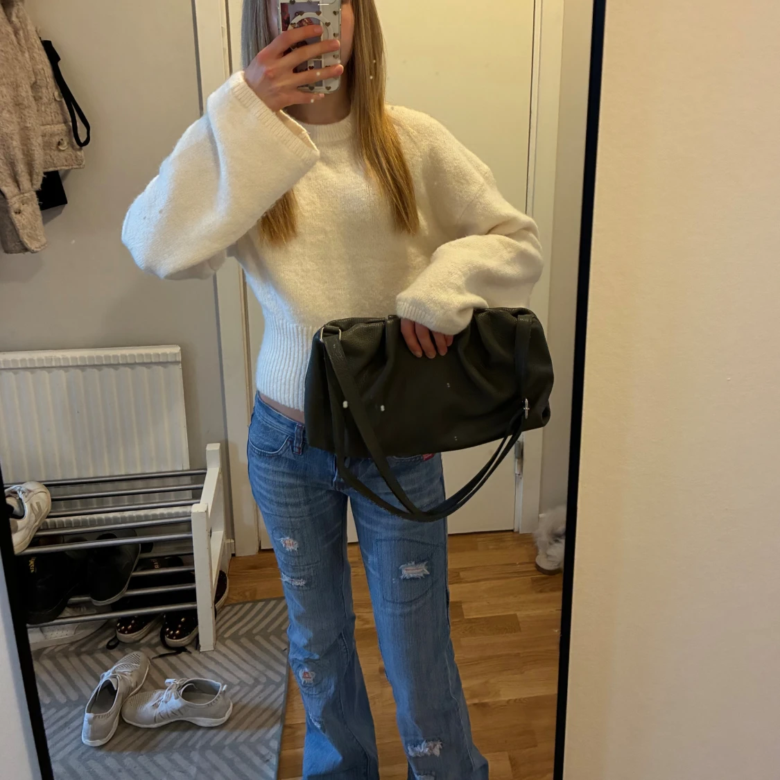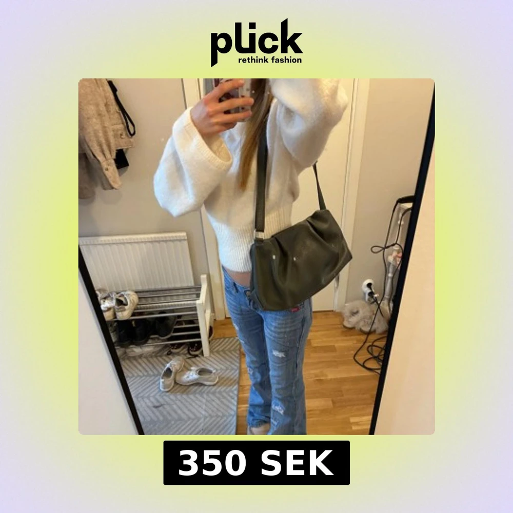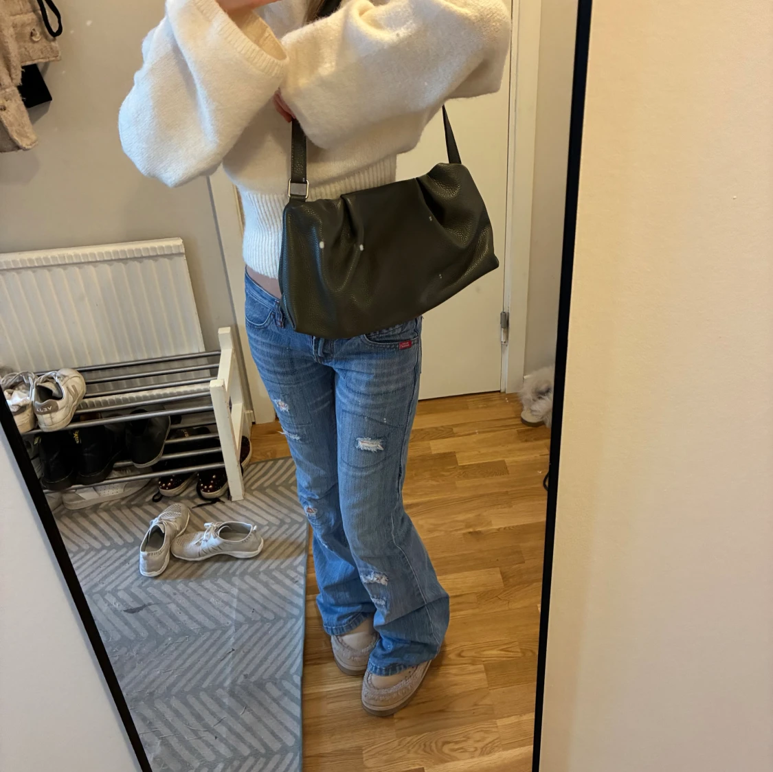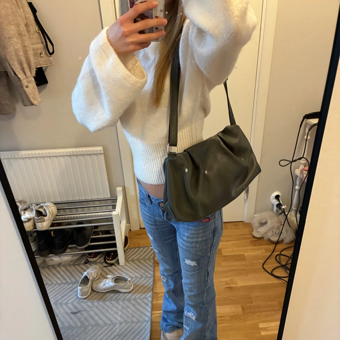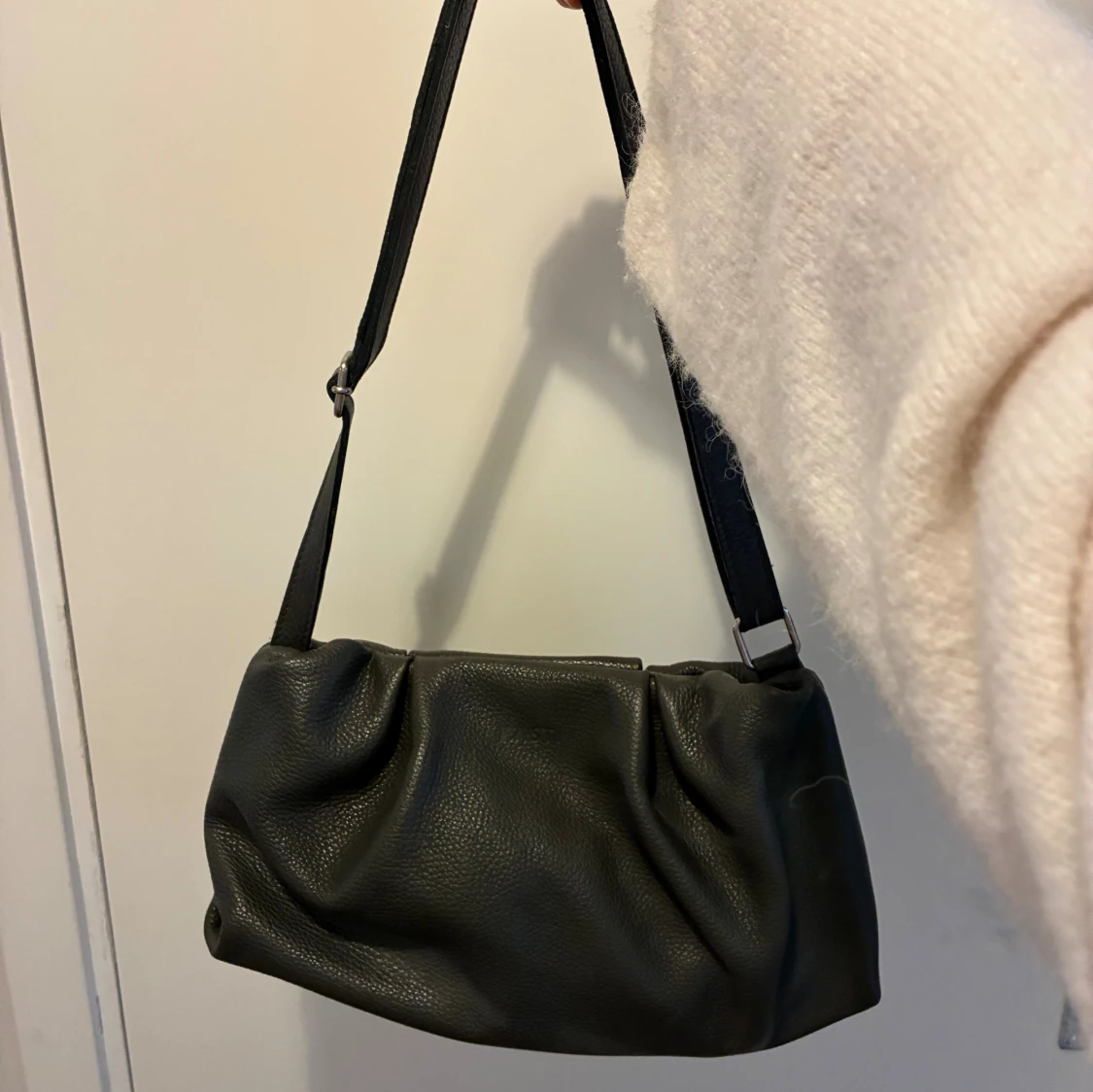 Snygg mörkgrön axelväska med mjuk, rynkad design och justerbar rem. Väskan är tillverkad i skinn med en stilren, enkel look och silverfärgade detaljer vid remfästena. Perfekt storlek för att få plats med allt nödvändigt och passar till många olika outfits.