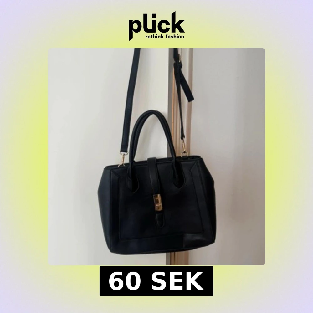 Stilren svart handväska i skinnimitation med både handtag och justerbar axelrem. Väskan har guldfärgade metalldetaljer, lås framtill och fötter undertill. Insidan har dragkedjefack och flera praktiska fack för dina grejer. Perfekt storlek för vardagsprylar.