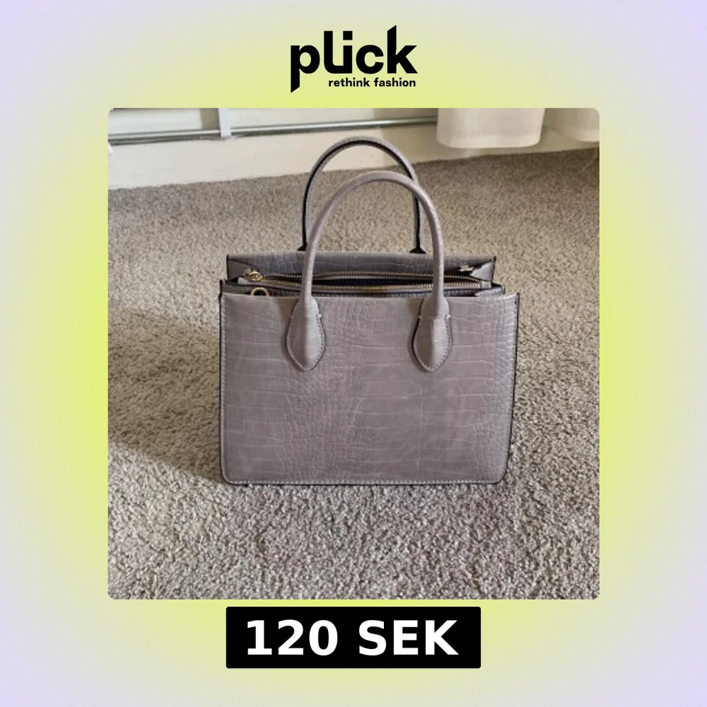 Snygg grå handväska i croco-mönstrat skinnimitation med guldiga detaljer och dragkedja. Väskan har både handtag och en avtagbar, bred axelrem i svart och vitt. Perfekt storlek för vardagens essentials och ger en clean, trendig look.