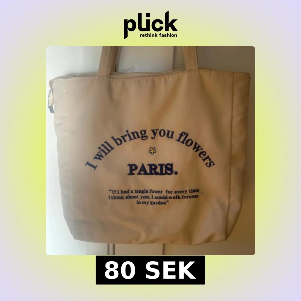 Snygg beige shoppingväska med texten 'I will bring you flowers PARIS' i blått. Väskan har två handtag och en dragkedja upptill för säker förvaring. Perfekt för en dag på stan eller som en stilren accessoar.