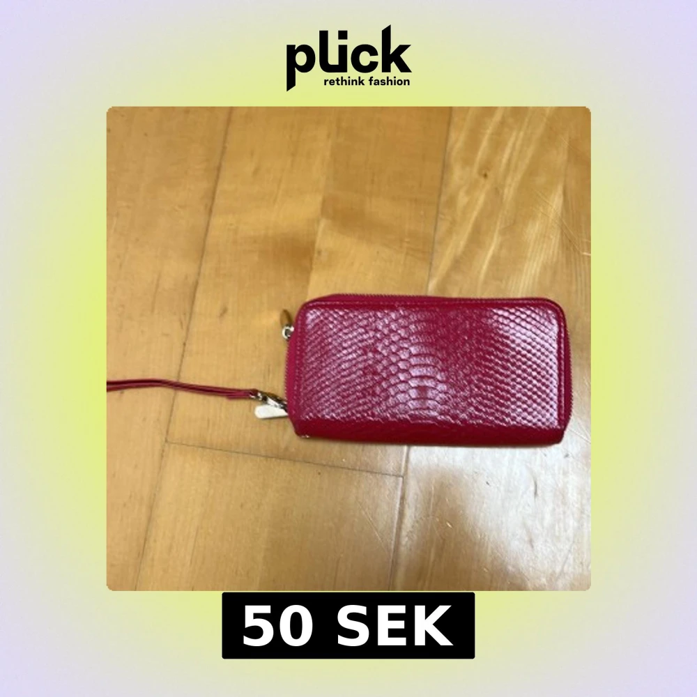Säljer en snygg röd plånbok med ormskinnsmönstrad yta och dubbla dragkedjor. Plånboken har flera fack för kort och mynt, samt en avtagbar handledsrem. Perfekt för dig som vill ha stil och ordning på dina grejer.