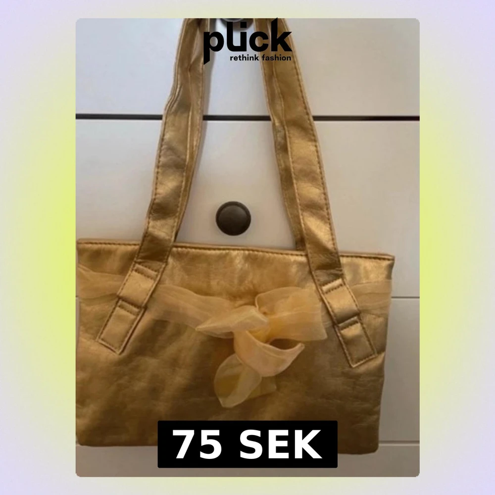 Stilren guldig handväska med dubbla axelband och en dekorativ rosett framtill. Väskan har en rektangulär form och är perfekt för dig som vill sticka ut med en glansig accessoar. Passar till många olika outfits och ger en lyxig känsla. Knapplås. Ingen dragkedja.