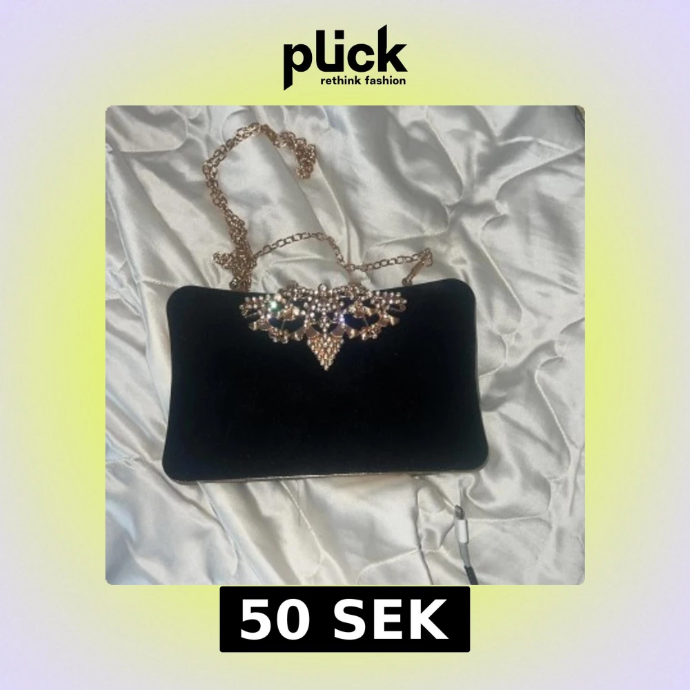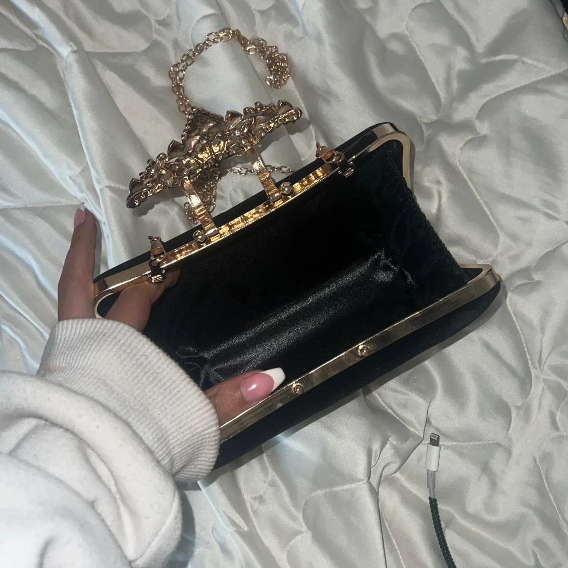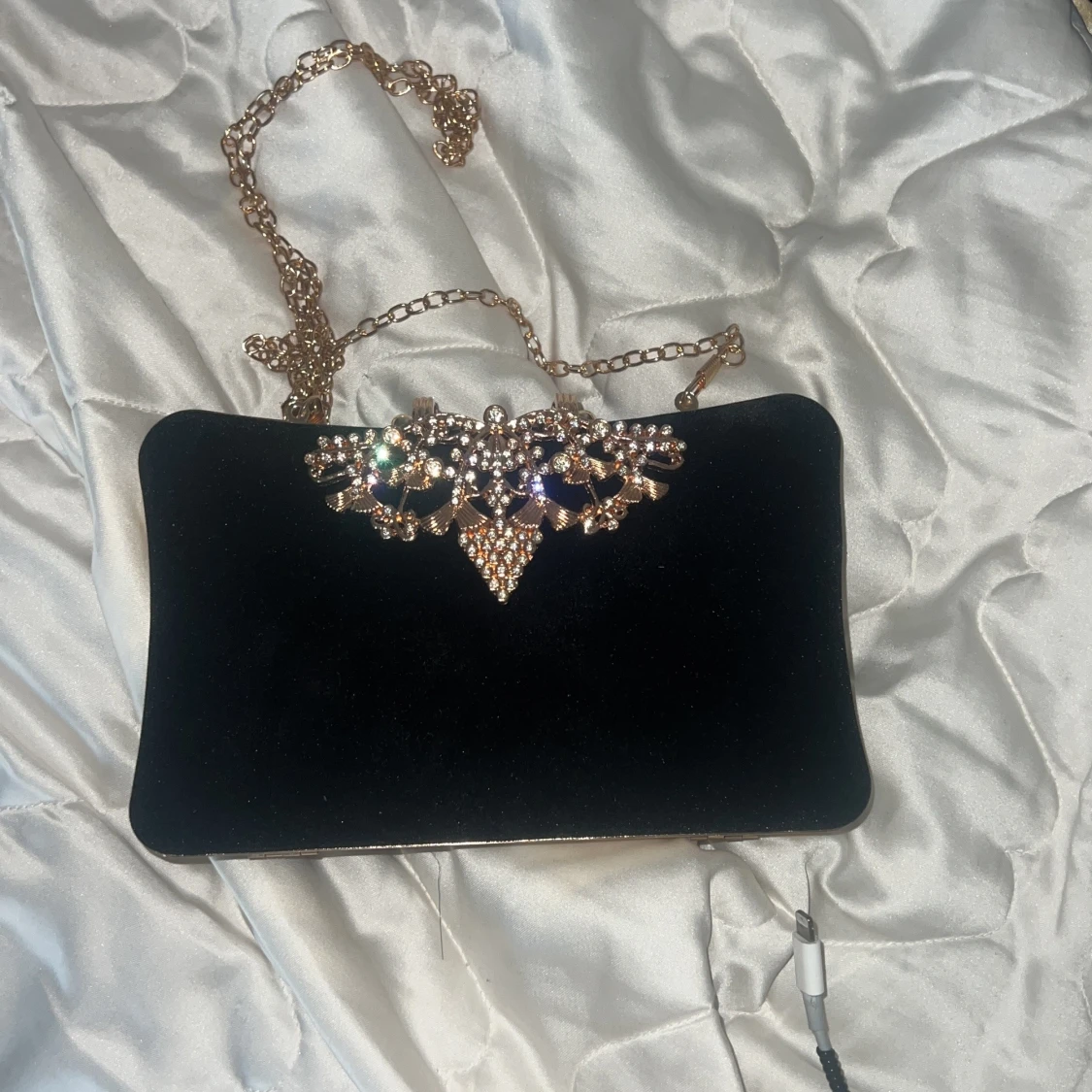Elegant svart kuvertväska i sammet med en glittrig guldkedja och dekorativa stenar på locket. Perfekt för en kväll ute eller speciella tillfällen. Väskan har en praktisk öppning och en lyxig känsla.