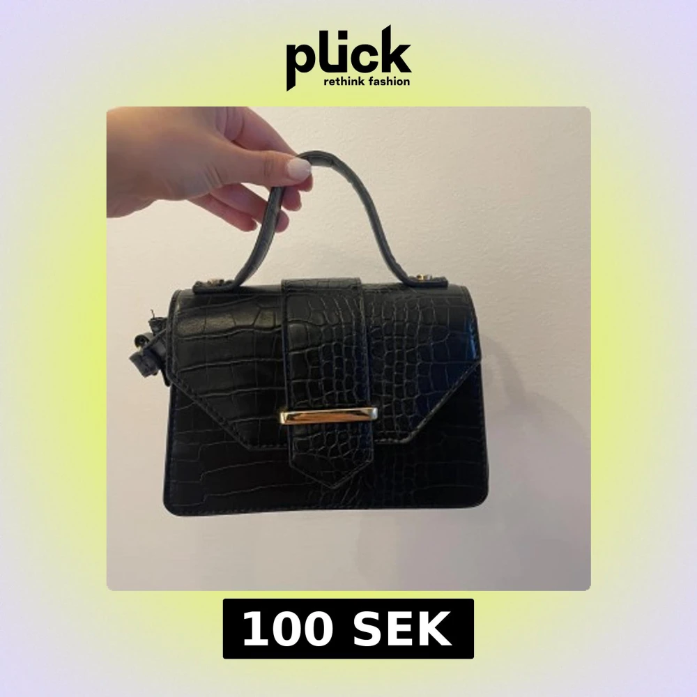 Snygg svart handväska med krokodilpräglat mönster och guldfärgad detalj på locket.