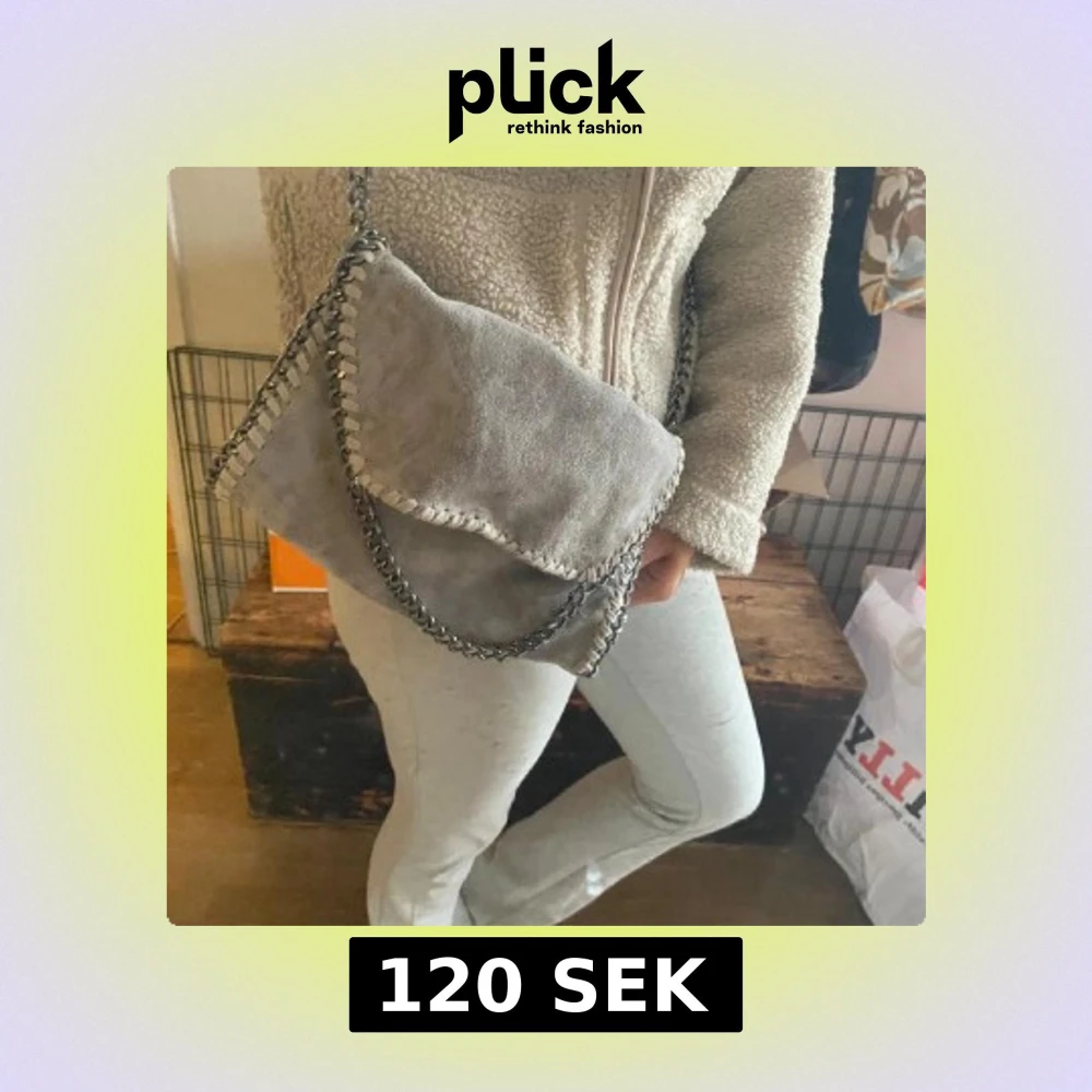 Snygg grå axelväska i mocka med grova kedjedetaljer längs kanterna och som axelrem. Väskan har en mjuk, slouchy form och dekorativa sömmar runt locket. Perfekt för dig som gillar stilrena accessoarer med lite edge.