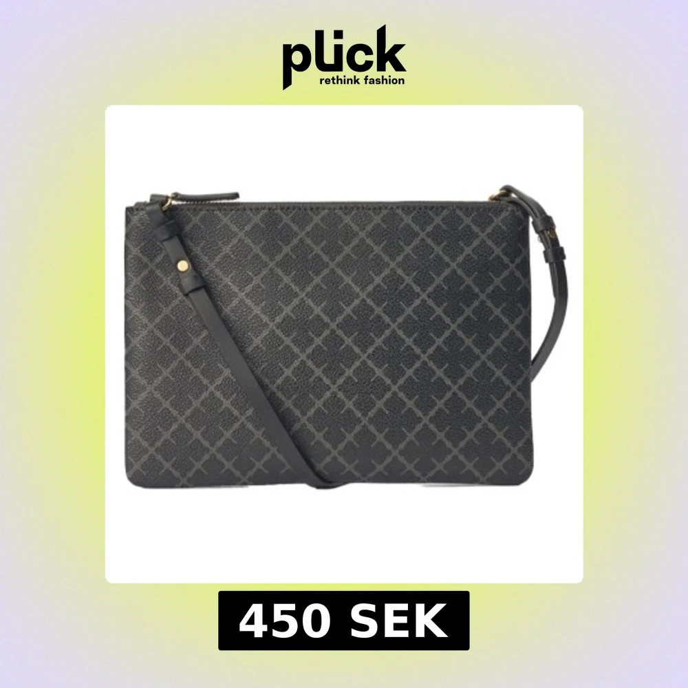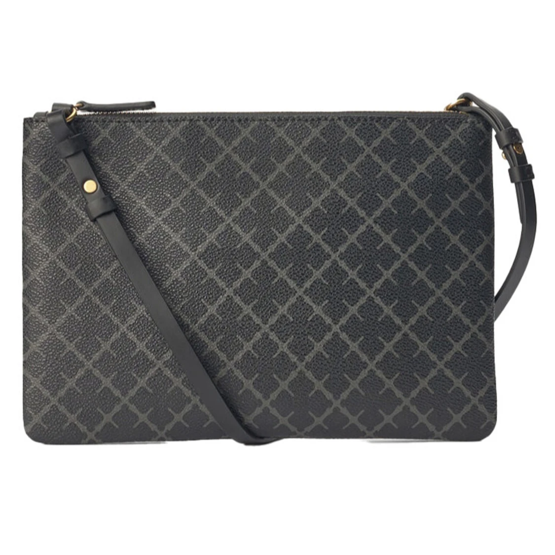 Stilren svart axelväska med rutigt mönster och justerbar rem. Väskan har en enkel, rektangulär form och stängs med dragkedja upptill. Tillverkad i tåligt syntetmaterial med diskreta gulddetaljer på remmen.