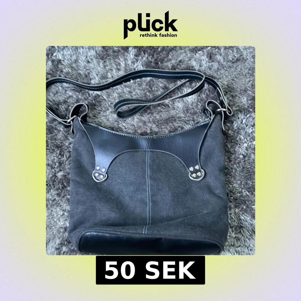 Snygg svart axelväska i en kombination av skinn och jeansmaterial. Väskan har en justerbar axelrem och dekorativa nitar. Perfekt för en stilren look.