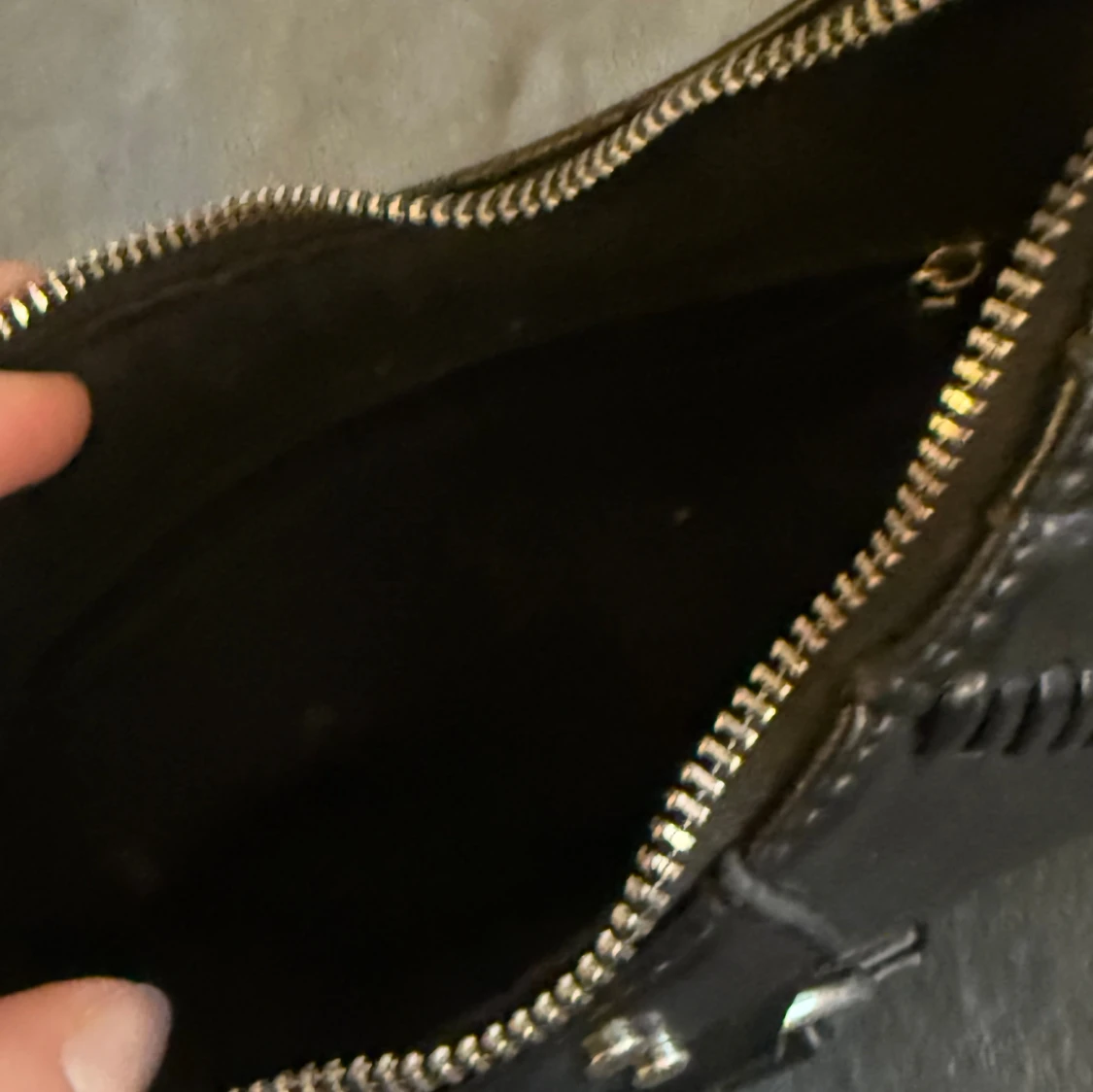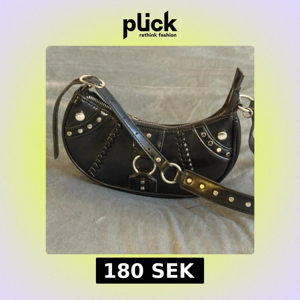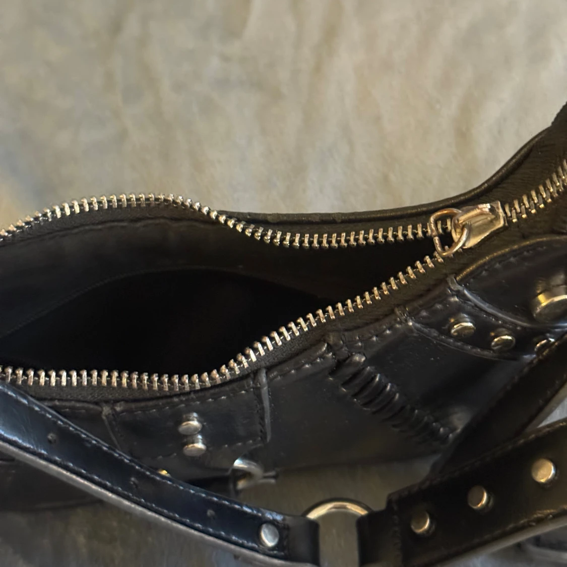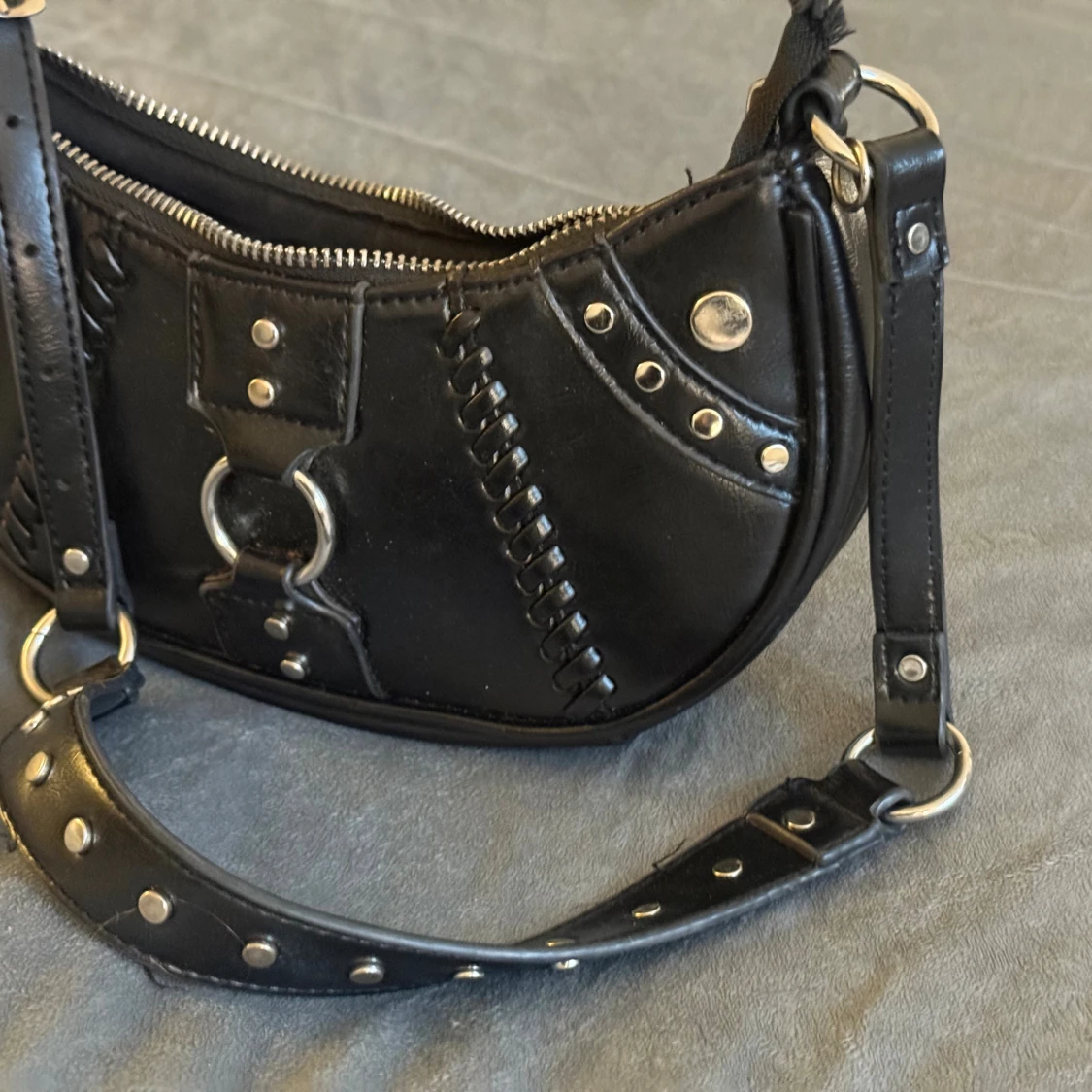 Cool svart axelväska i skinn med silvriga nitar, ringdetaljer och dekorativa sömmar. Väskan har en böjd form, justerbart axelband och dragkedja upptill. Perfekt för dig som gillar edgy och unik stil. Dragkedjan funkar👍🏼
