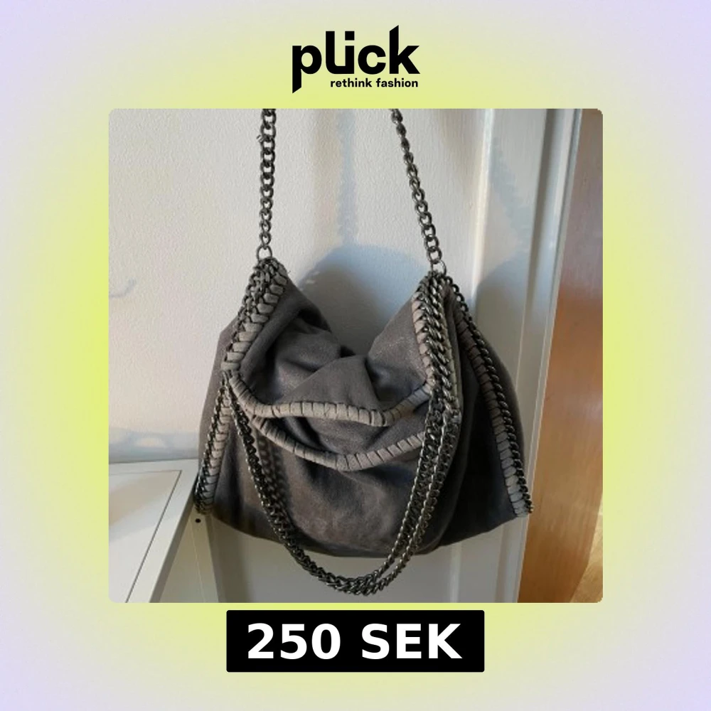 Snygg grå axelväska med kedjedetaljer som ger en cool look. Väskan har en mjuk form och är perfekt för att bära med sig det nödvändigaste. Den har en unik design med kedjor som löper längs kanterna och axelremmen.