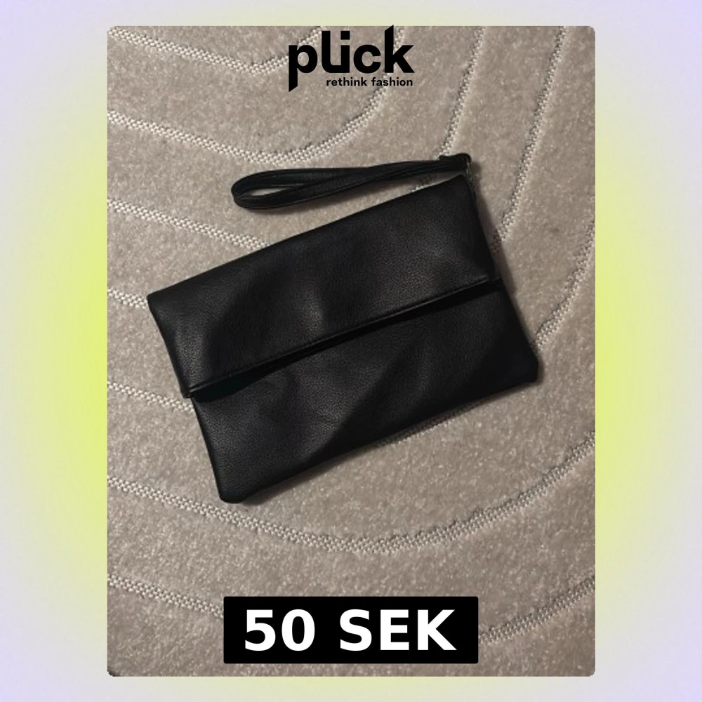 Stilren svart kuvertväska med handledsrem i skinnimitation. Enkel och klassisk design utan synliga detaljer eller mönster. Perfekt storlek för det viktigaste och lätt att bära med sig.