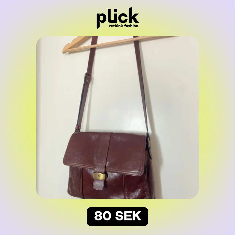 Brun skinnväska med justerbar rem från Three Bags of Finland. 30x21x8.