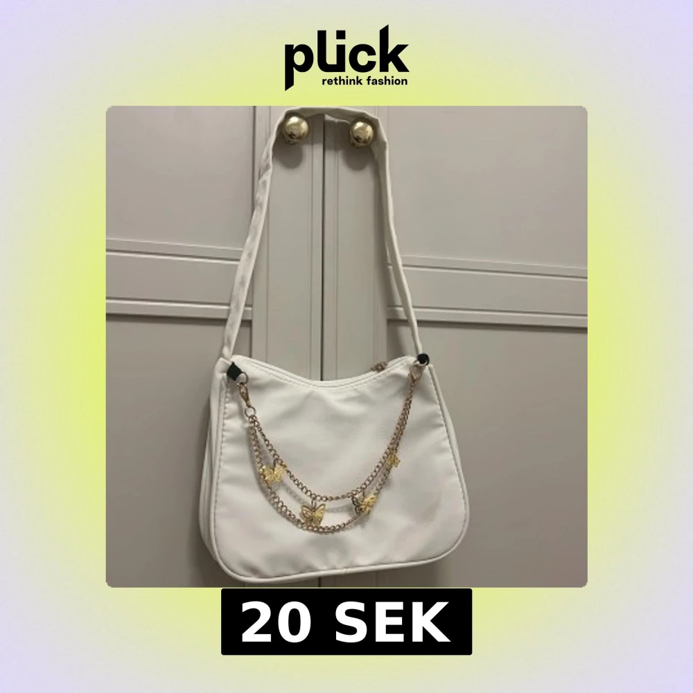 Snygg vit axelväska i syntetmaterial med mjuk form och dragkedja upptill. Framsidan är dekorerad med en guldfärgad kedja och små fjärilar som ger väskan en unik och trendig look. Perfekt storlek för det viktigaste och enkel att bära över axeln.