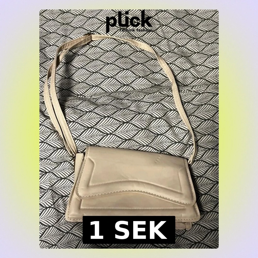 Snygg beige axelväska med stilren design och justerbart axelband. Väskan har ett lock med markerade sömmar och är tillverkad i slätt skinn. Perfekt för dig som vill ha en enkel men trendig accessoar till din outfit.