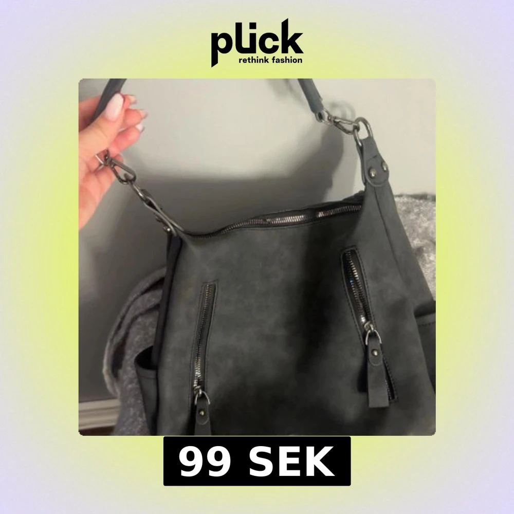 Snygg svart axelväska i mockaimitation med flera dragkedjefickor framtill och baktill. Väskan har bred axelrem med metallspännen och rymligt foder inuti. Perfekt för dig som vill ha en stilren och praktisk väska med coola detaljer. Fick denna i födelsedagspresent därav vet jag ej nypris eller vart den kommer ifrån.