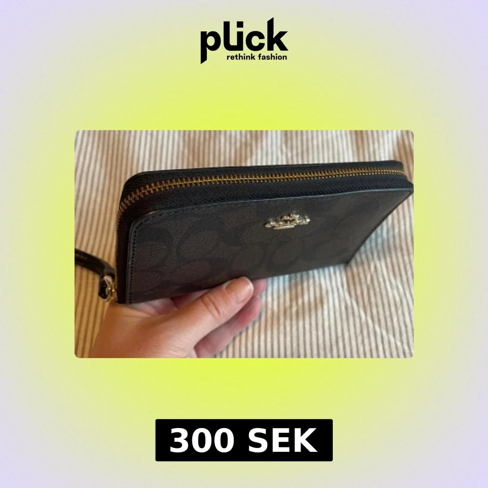 Snygg svart plånbok från Coach med diskret mönster och guldfärgad dragkedja. Plånboken har en praktisk handledsrem och flera fack för kort och kontanter. Materialet är skinn och insidan är stilren med plats för allt du behöver.