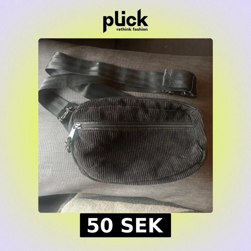 En svart magväska i manchester med bredt justerbart band och dragkedja till två olika fack. Väskan har ett ribbat tyg och en enkel, rundad form. Perfekt för att bära det viktigaste när du är ute eller på stan. Den är knappt använd förutom några fläckar av färg på insidan som inte alls syns, luktar eller påverkar på något annat sätt.