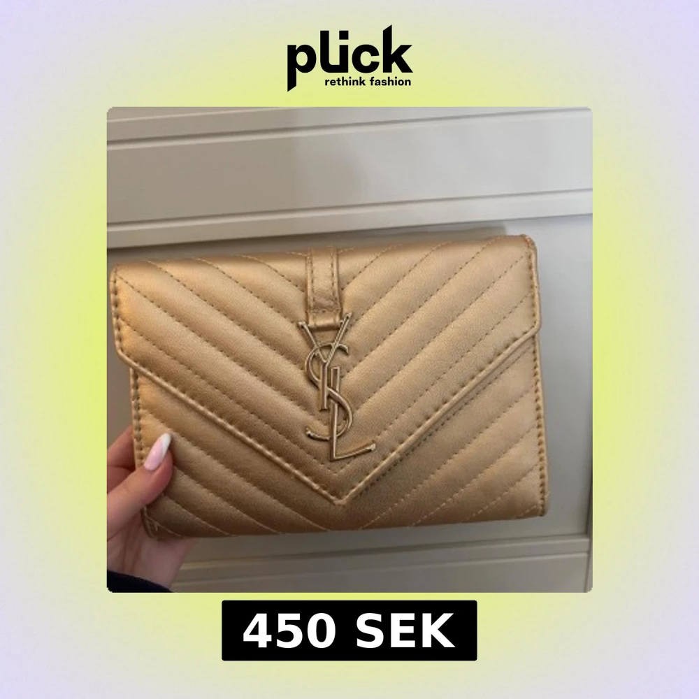 Snygg kuvertväska i guldigt skinn med quiltad design och ikoniska YSL-loggan framtill. Väskan har flera fack inuti, inklusive ett med dragkedja, och stängs med magnetlås. Perfekt för dig som vill sticka ut med en lyxig accessoar.