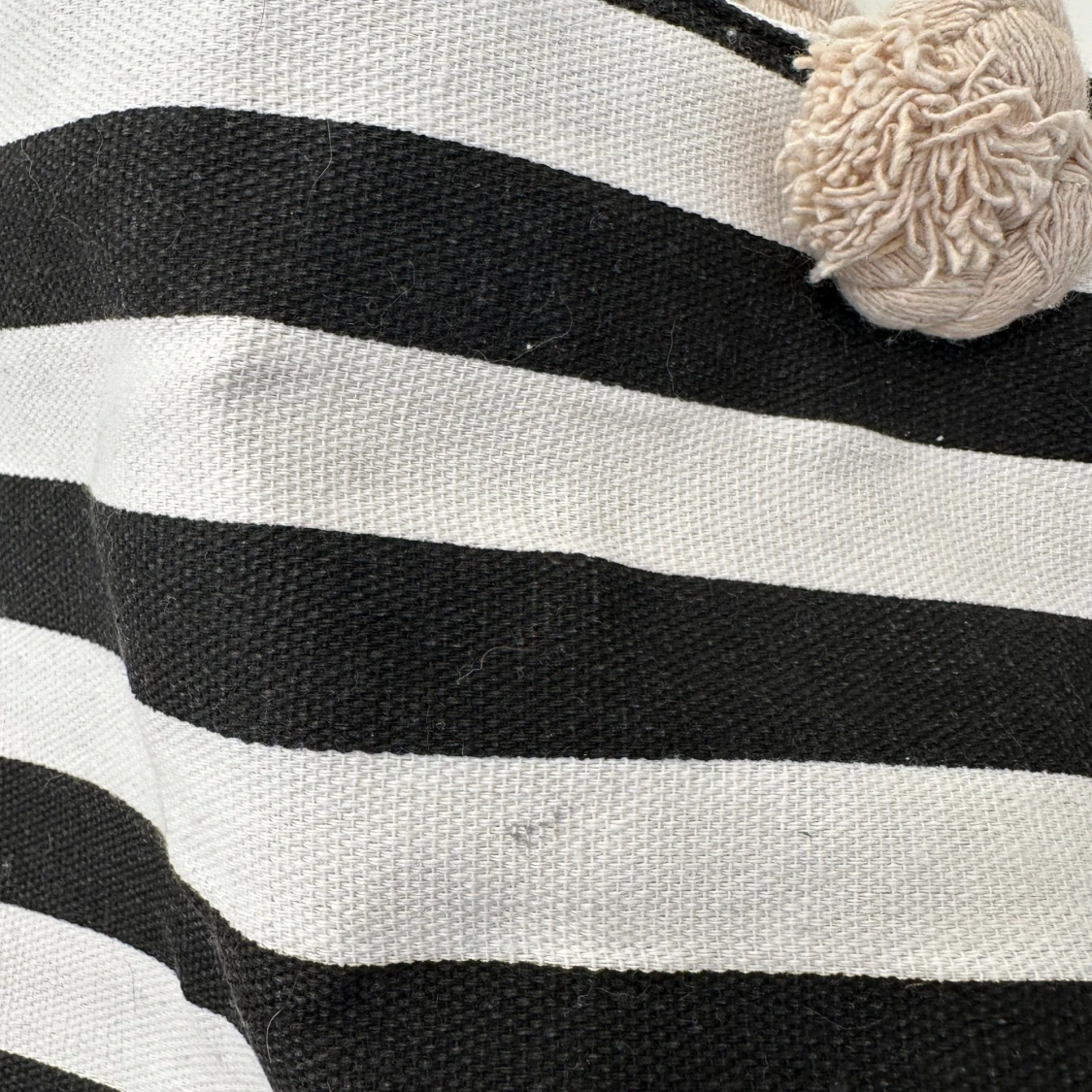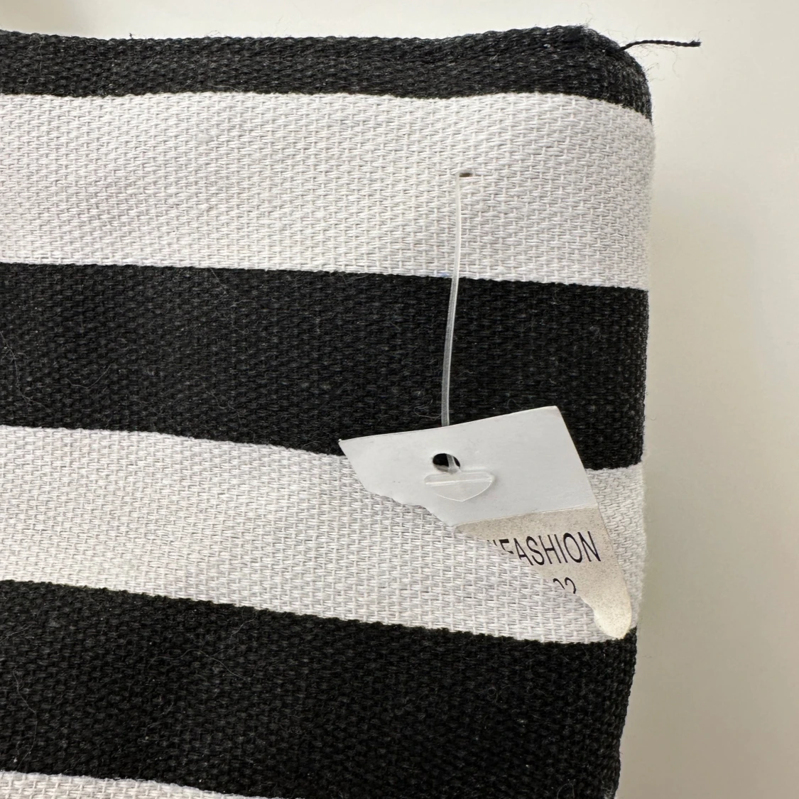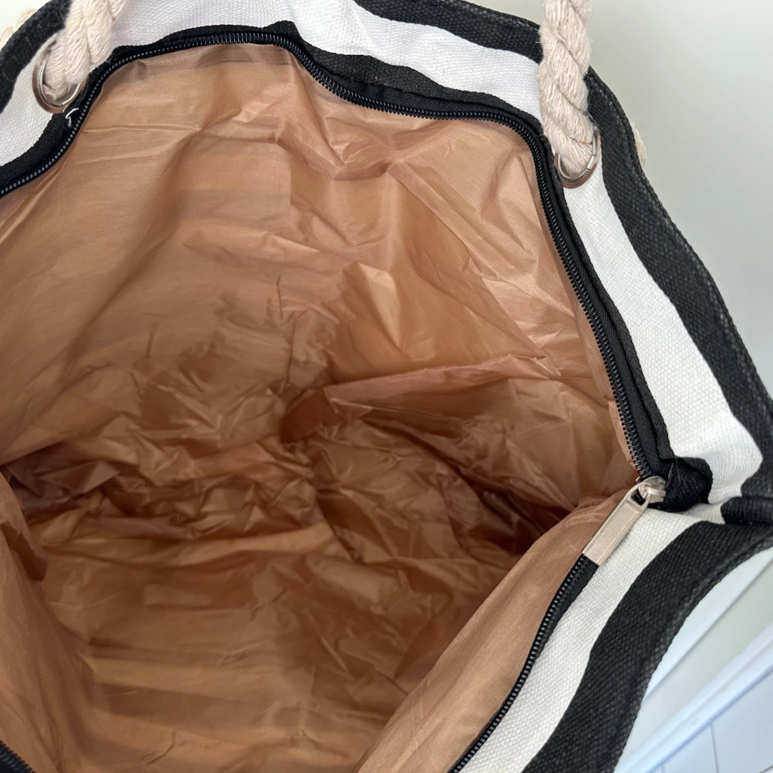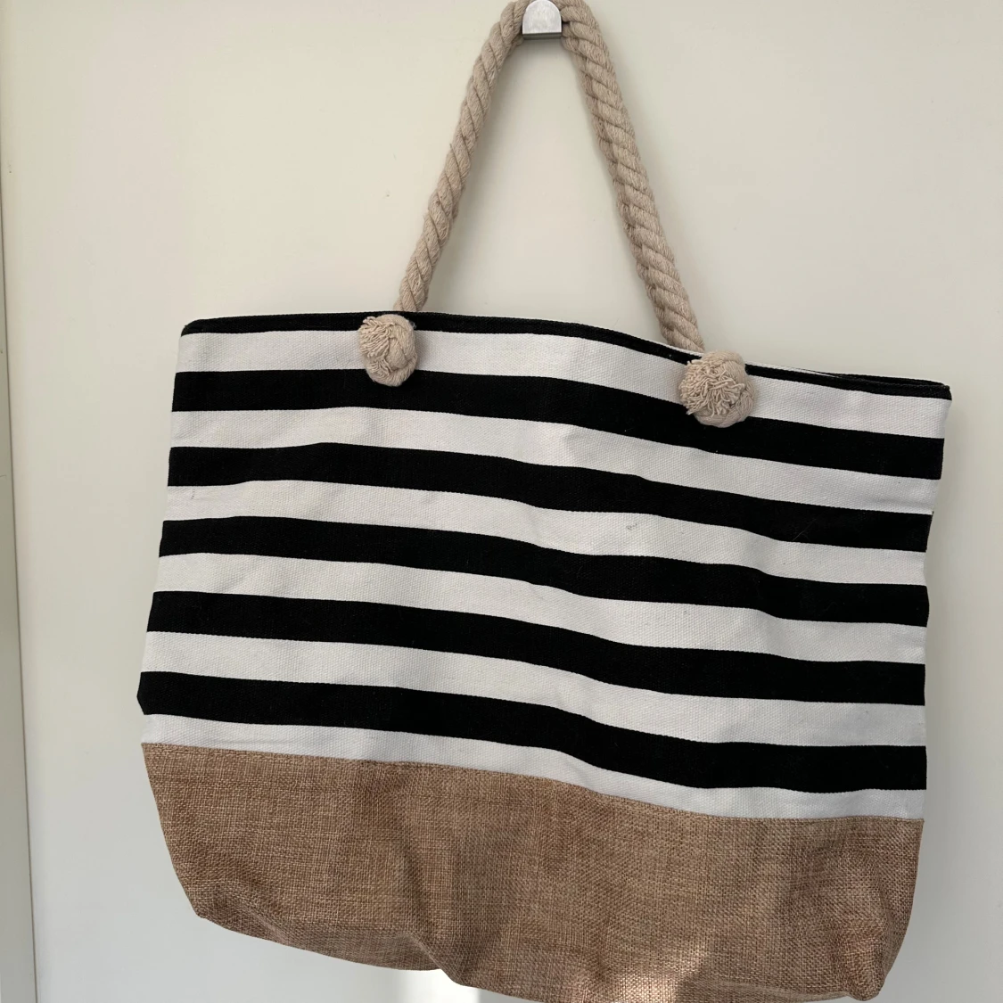 Stor och rymlig shoppingväska från MeFashion med svartvita ränder och beige botten. Väskan har grova rep-handtag och stängs med dragkedja. Insidan är fodrad i beige och har en praktisk ficka. Perfekt för att bära med sig allt man behöver. En liten fläck går säkert bor i tvätt, se bild