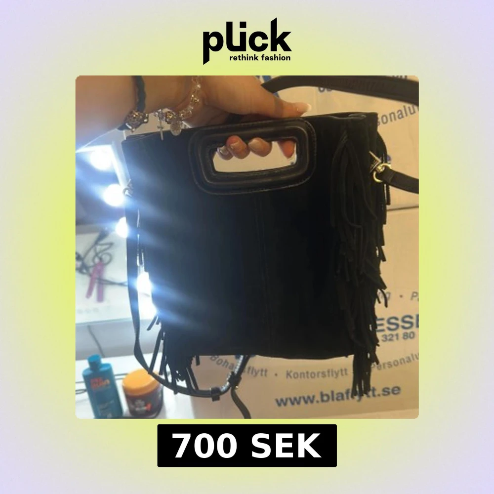 Säljer en svart axelväska från Maje i mocka med coola fransdetaljer på sidorna. Väskan har både handtag och axelrem, samt en snygg rektangulär form. Perfekt för dig som vill ha en unik och trendig accessoar.