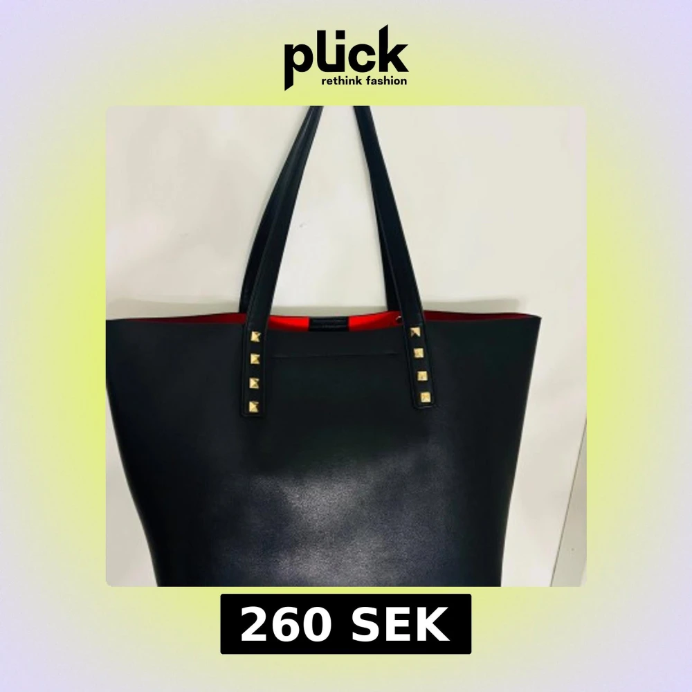 Stilren svart shoppingväska från Even&Odd med guldfärgade nitar på handtagen och röd insida. Väskan har en innerficka med dragkedja och tryckknappsstängning upptill. Perfekt för dig som vill ha plats med allt du behöver.