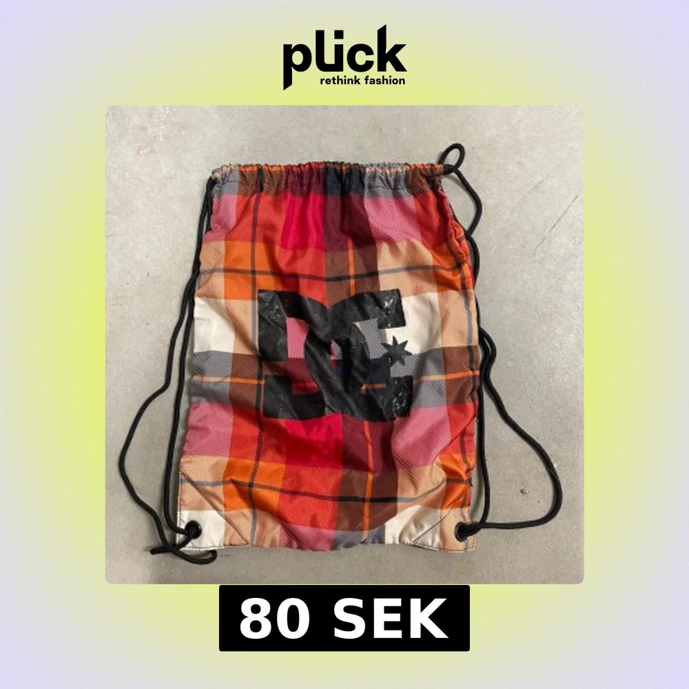 Säljer en färgglad gympåse från DC med rutigt mönster i rött, orange, svart och vitt. Väskan har dragskostängning med svarta snören och stor DC-logga på framsidan. Perfekt för träning eller vardagsäventyr.