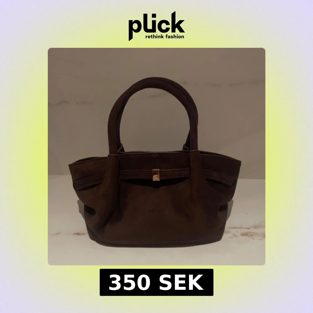 Snygg brun handväska i mocka med både handtag och avtagbar axelrem. Väskan har en elegant design med en liten guldfärgad detalj på framsidan.