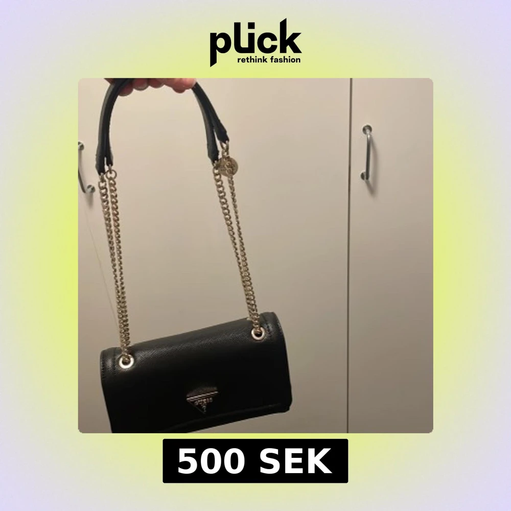 Snygg svart GUESS axelväska med guldfärgade kedjor och en elegant design. Väskan har en strukturerad yta och en dekorativ detalj på framsidan. Perfekt för att ge din outfit en lyxig touch.