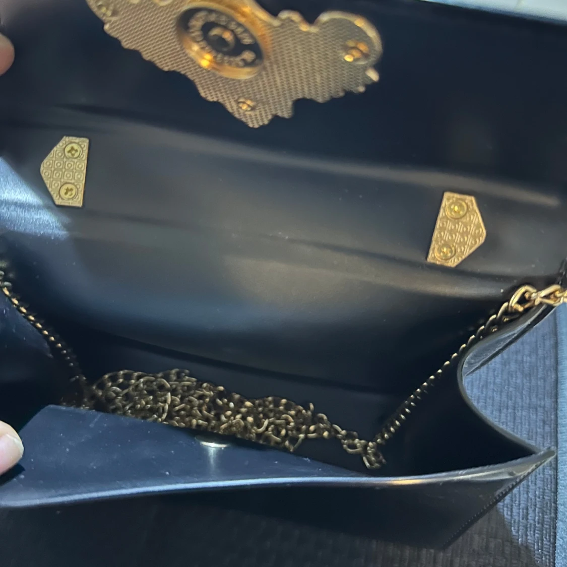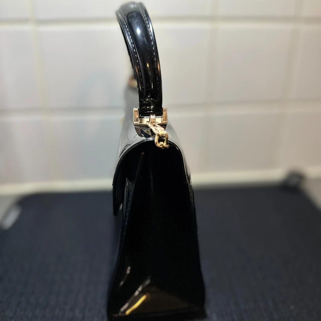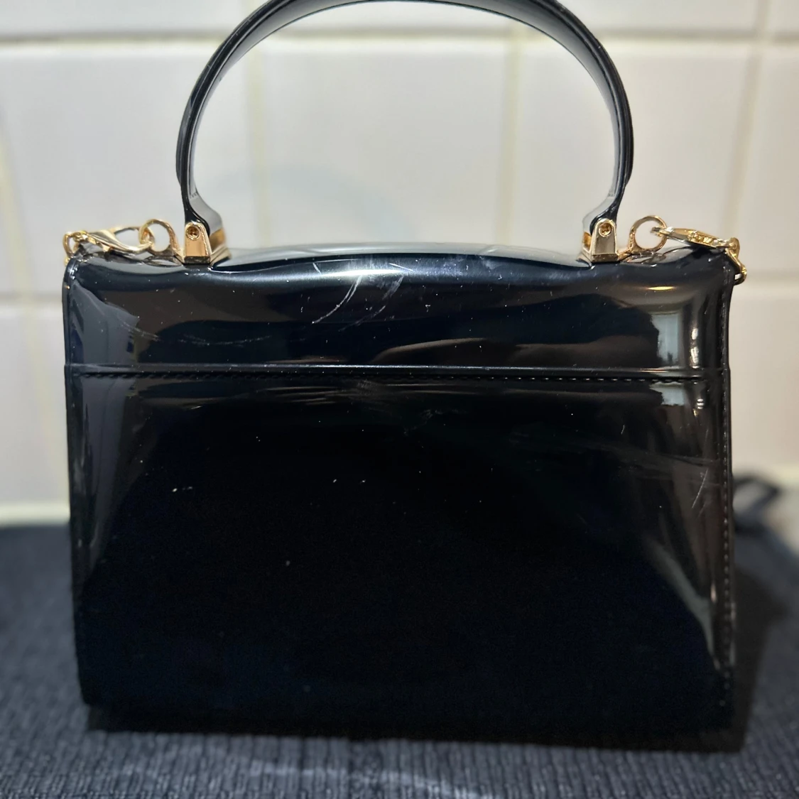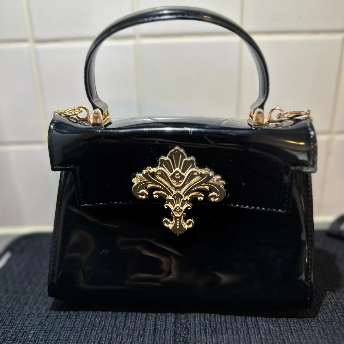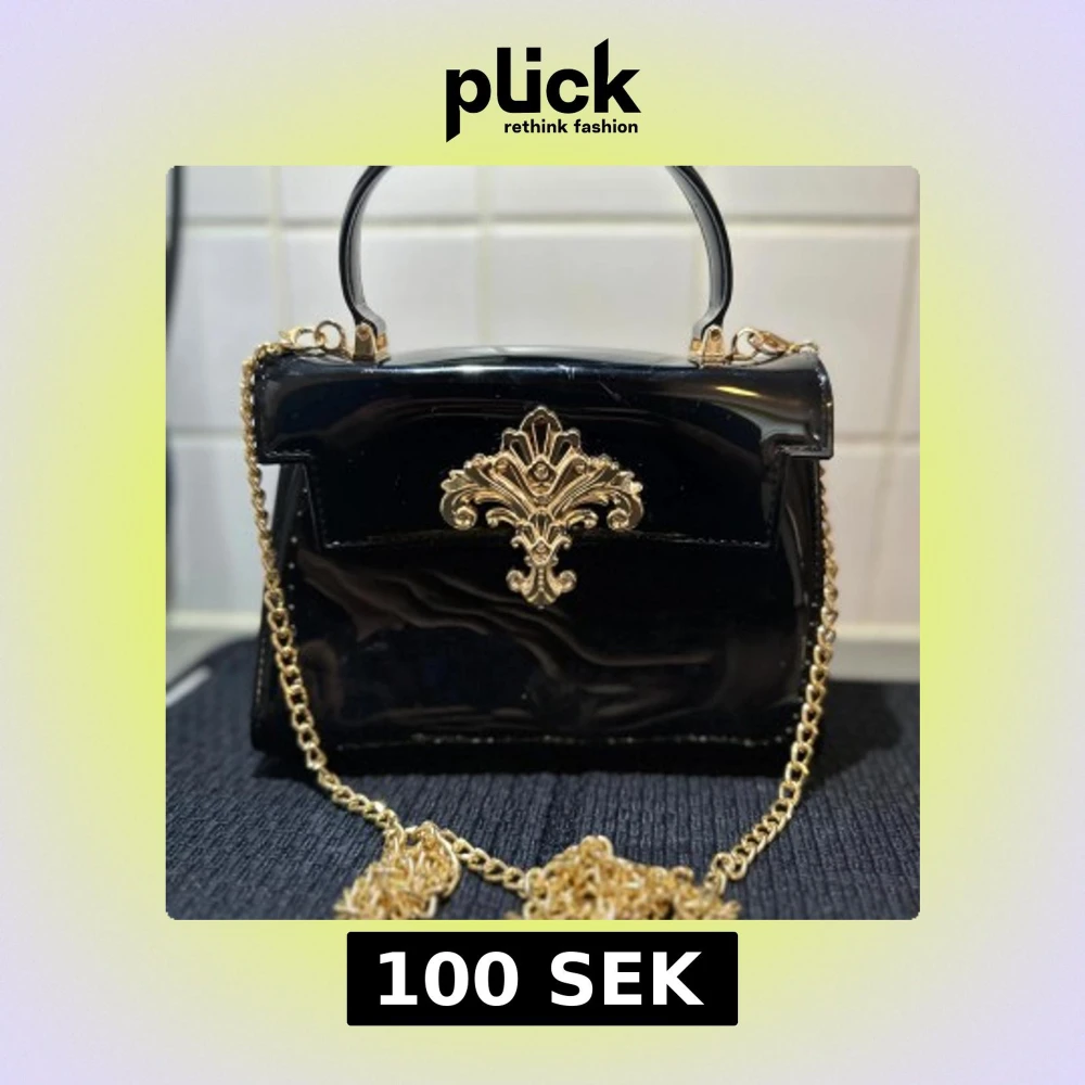 Säljer en svart, glansig handväska med guldfärgad kedja och dekorativt guldfäste framtill. Väskan har ett handtag upptill och avtagbar axelrem i kedja. Perfekt för dig som vill ha en elegant accessoar med lyxig känsla.