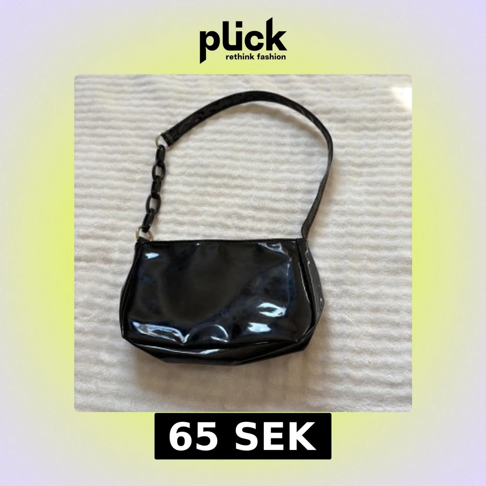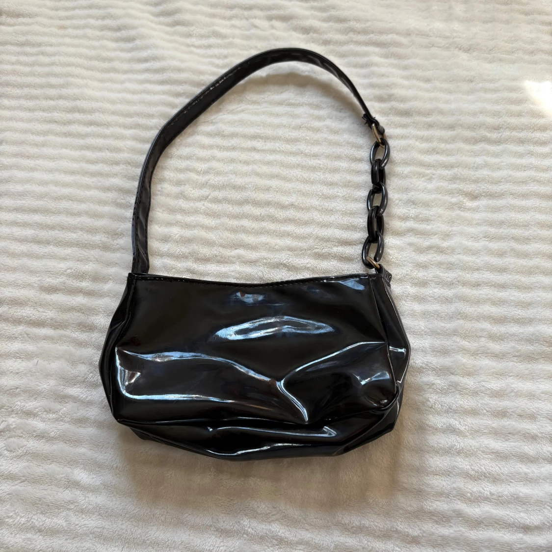 Snygg svart axelväska i glansigt syntetmaterial med cool kedjedetalj på axelremmen. Väskan har en enkel, stilren design och passar perfekt när du vill addera lite edge till din outfit. Rymmer mobil, plånbok och andra småsaker.