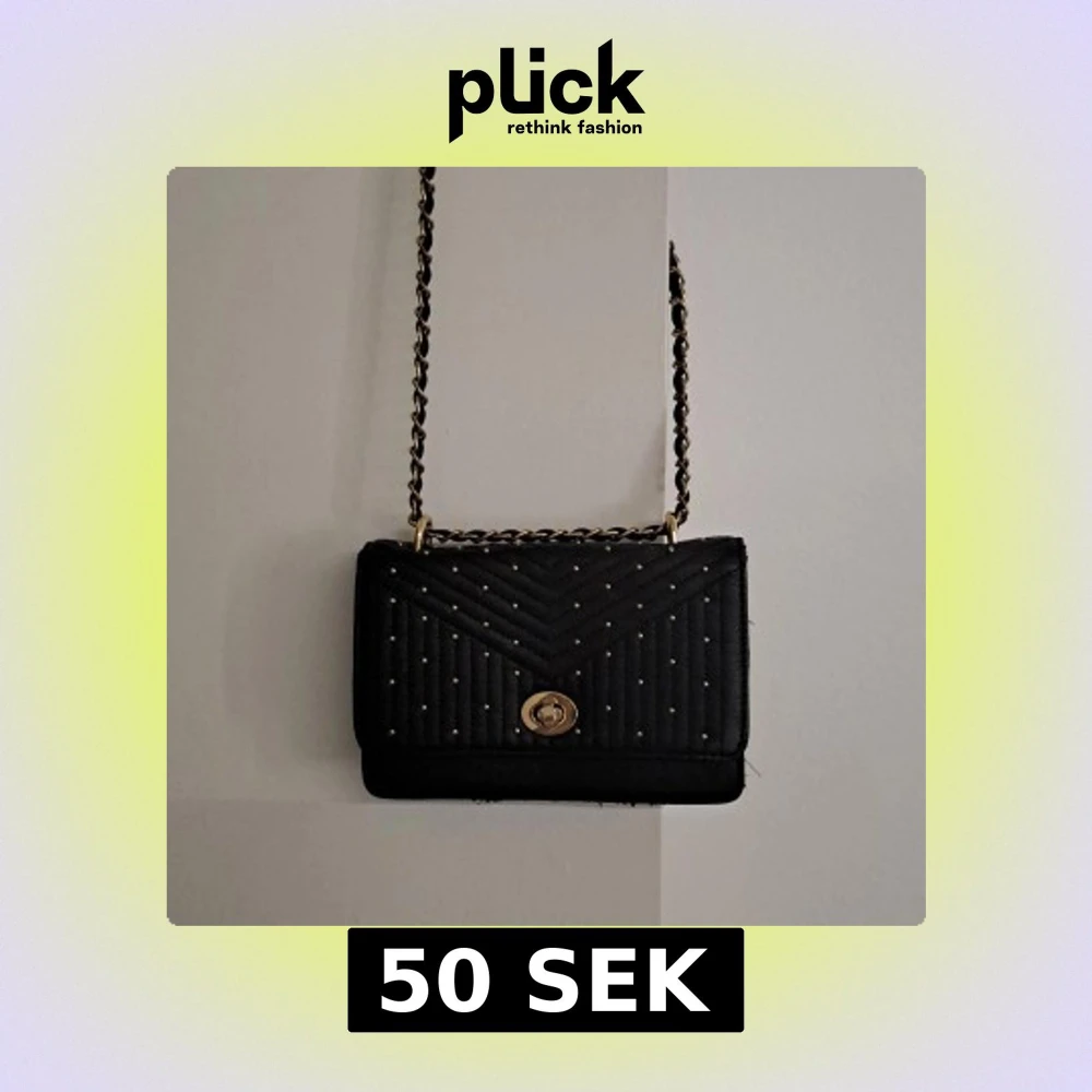 Snygg svart axelväska med quiltad framsida och små guldfärgade nitar. Väskan har en kedjerem i guld och svart som går att justera storleken på, samt ett vridlås i guld. Insidan har kortfack och dragkedja. Perfekt för att lyfta din outfit.