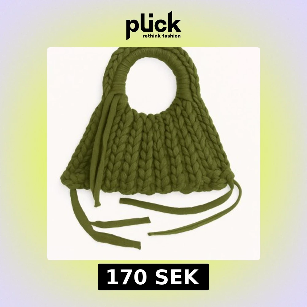 Unik handväska i olivgrönt, grovstickat material med runda handtag och långa knytband. Väskan har en cool, chunky look och passar perfekt för dig som vill sticka ut med accessoarerna.
