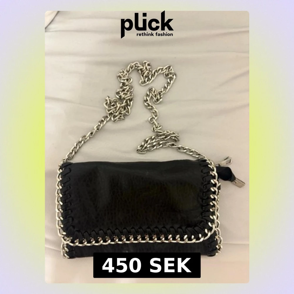Säljer en svart axelväska från Tiamo i skinnimitation med grov silverfärgad kedja som axelrem och detaljer längs kanterna. Väskan har magnetlås, innerfack med dragkedja och coolt flätad kant. Perfekt för dig som gillar edgy accessoarer. Lite smutsiga för dom har varit i källare aldrig använt säljer båda för 450kr pris kan vi diskutera