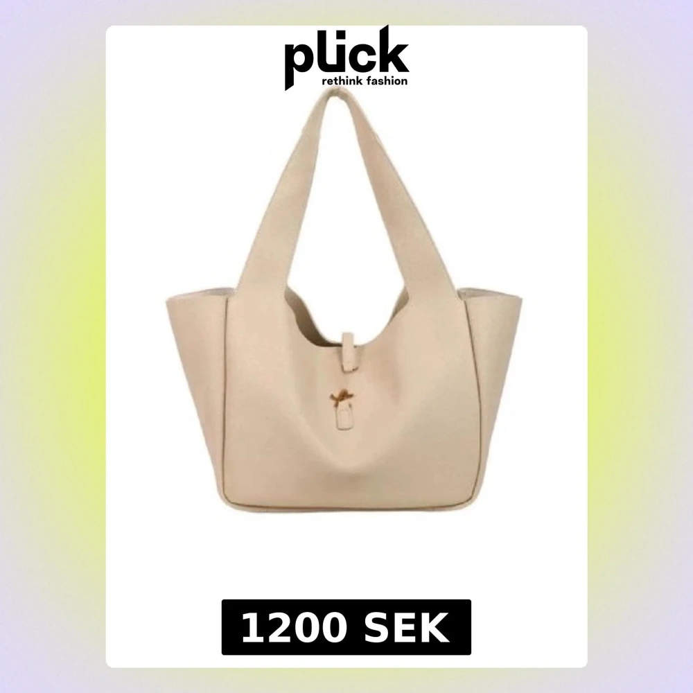 Stilren beige handväska med breda axelband och enkel design. Väskan har en mjuk, rundad form och stängs med ett litet spänne framtill. Perfekt för dig som gillar minimalistisk stil och vill ha plats för allt du behöver.