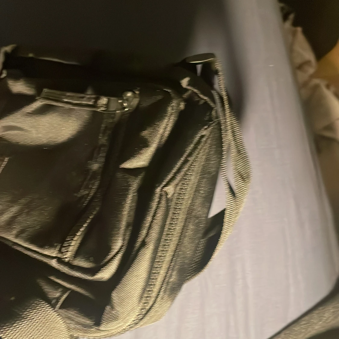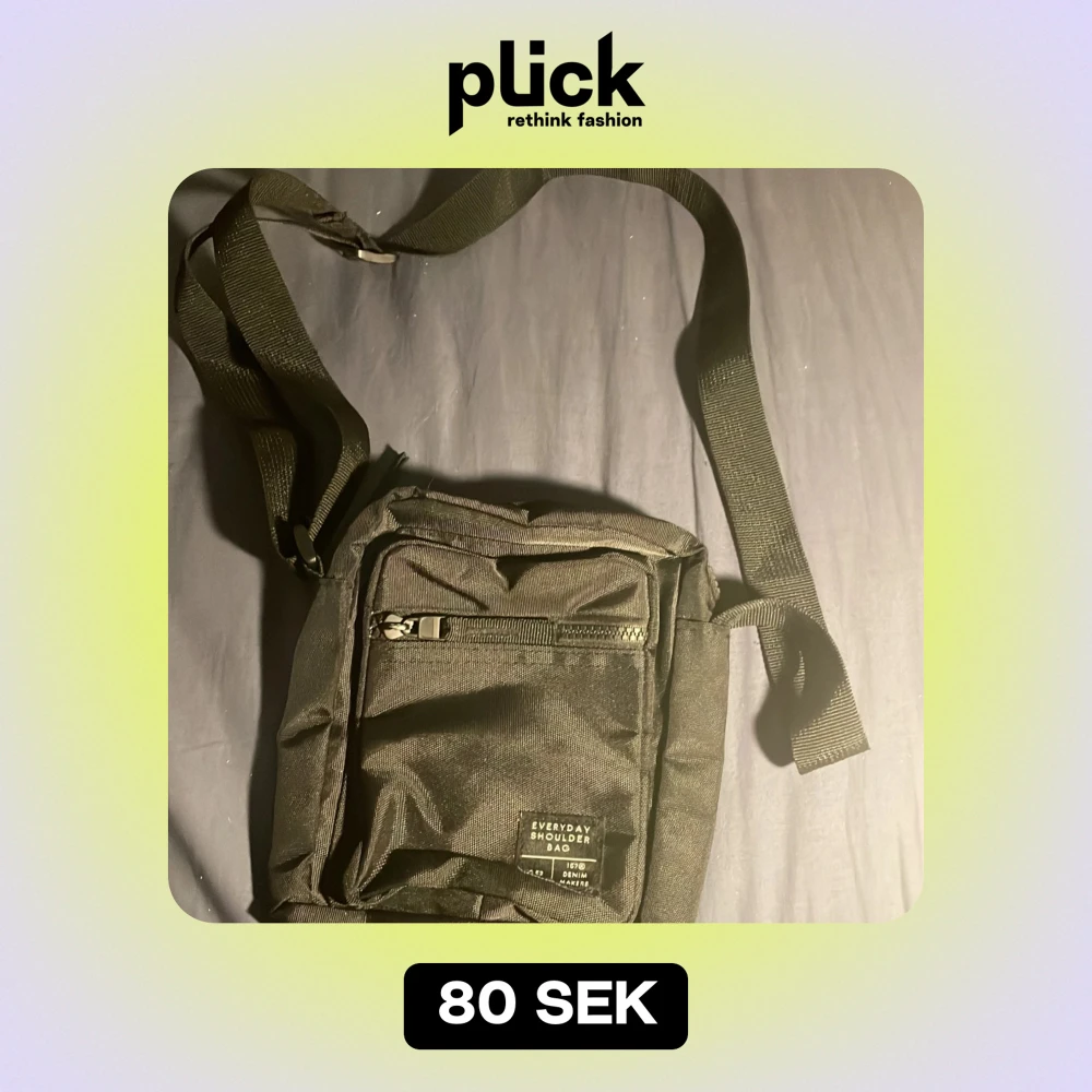 Säljer en praktisk svart axelväska i syntetmaterial. Den har en justerbar axelrem och en dragkedja framtill för extra förvaring. Perfekt för vardagsbruk och enkel att matcha med olika outfits.