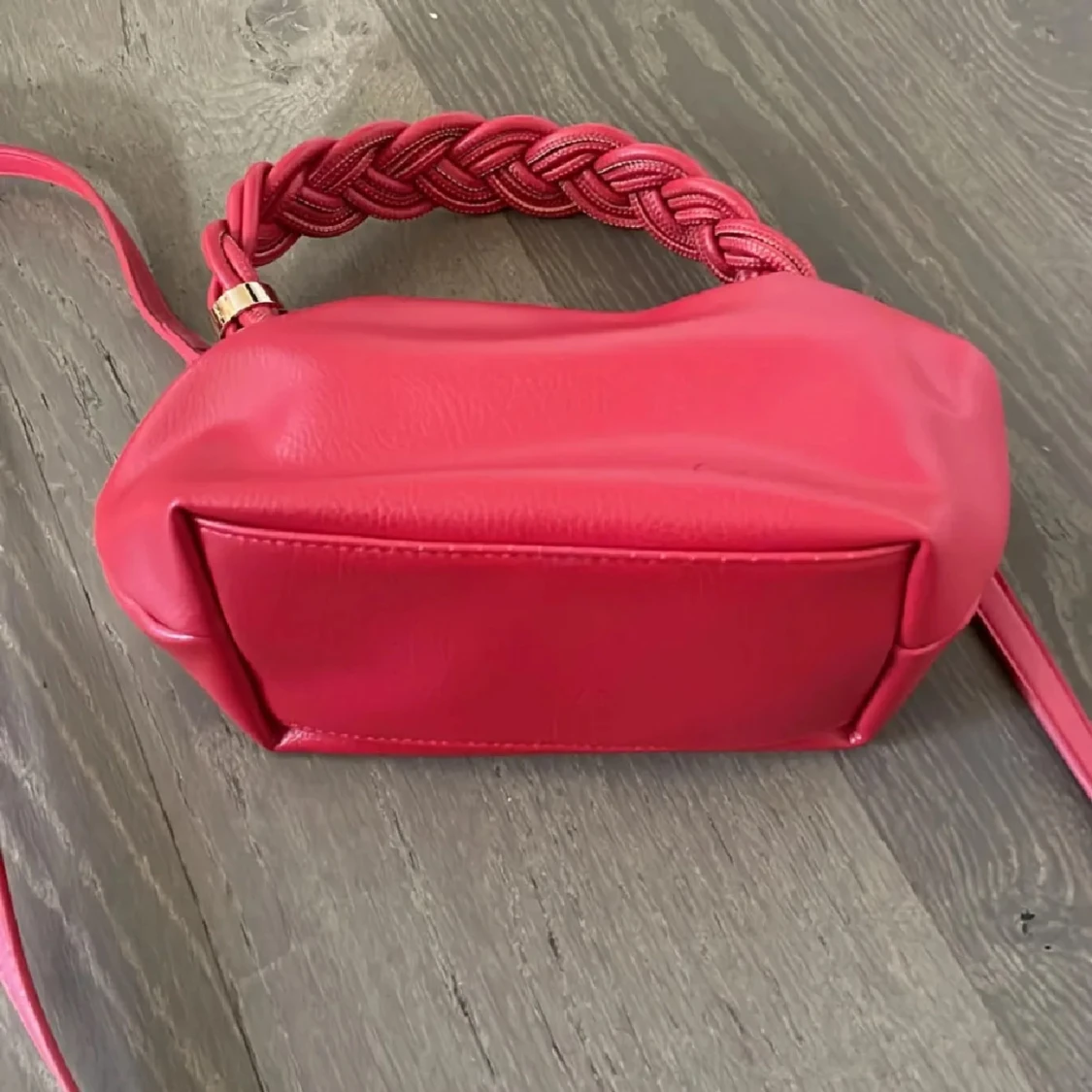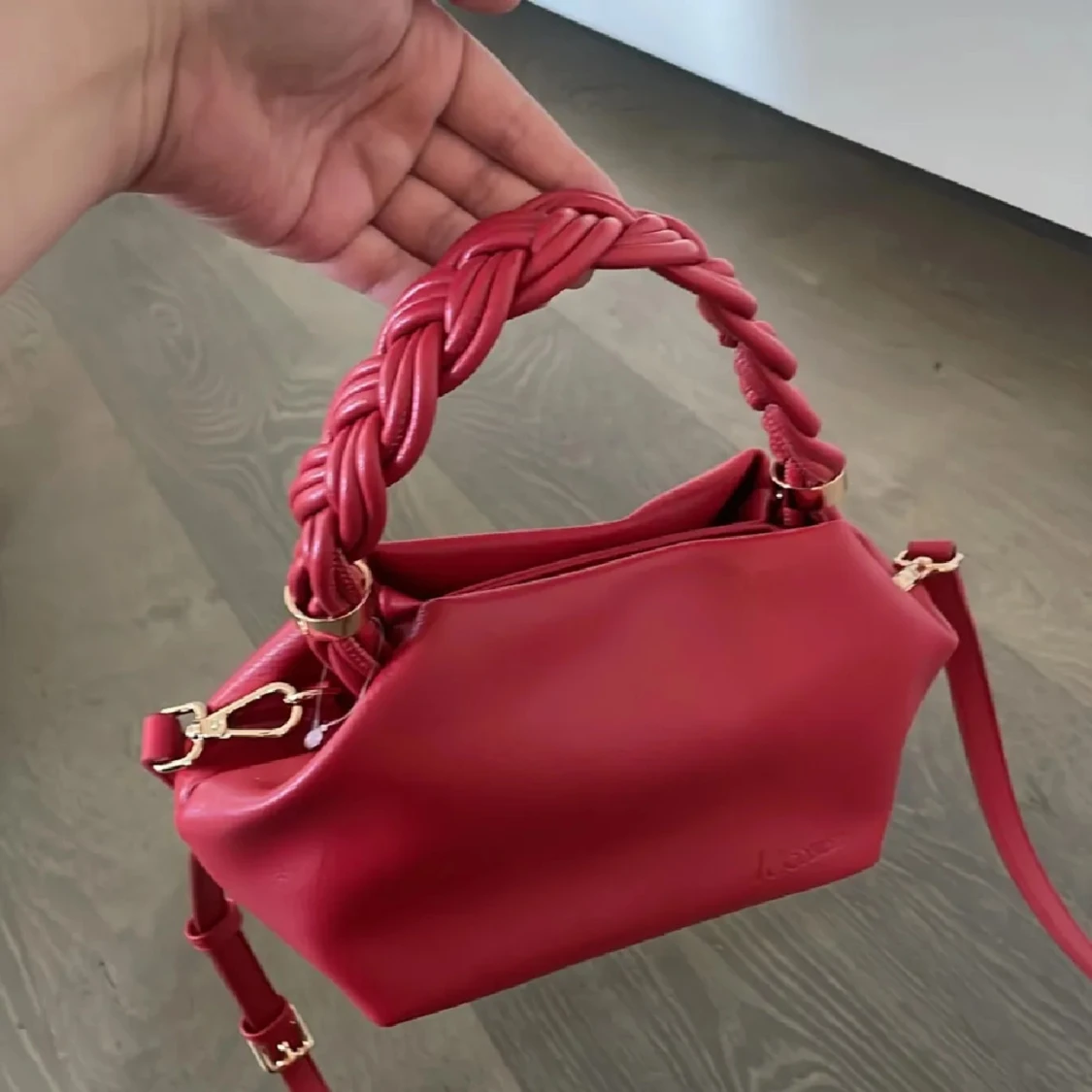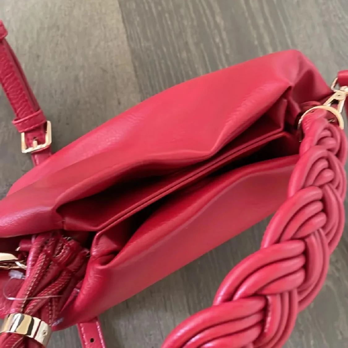 Snygg röd handväska från L.Credi i skinnimitation med flätat handtag och justerbar axelrem. Väskan har guldfärgade metalldetaljer och ett rymligt huvudfack. Perfekt för dig som vill ha en trendig accessoar med cool design.
