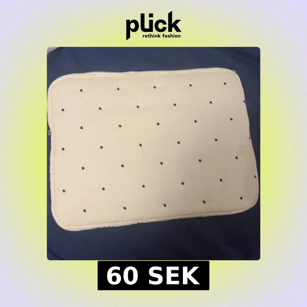 Säljer en stilren vit datorväska med svarta prickar och dragkedja runt kanten. Väskan har en mjuk och vadderad känsla, perfekt för att skydda din laptop. Enkel och snygg design som passar till det mesta. Den är helt ny