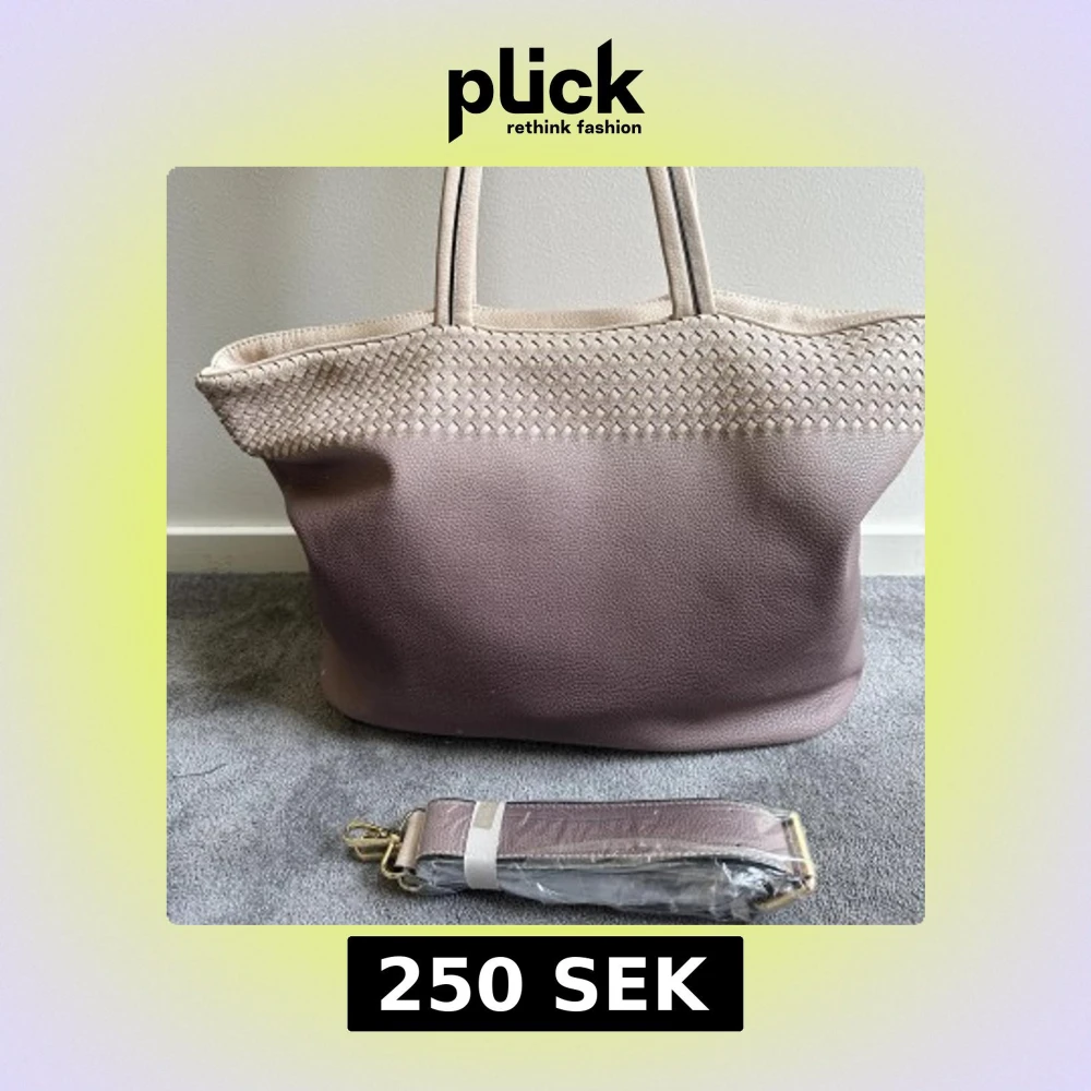 Stor axelväska i beige och ljuslila skinnimitation med flätad detalj upptill. Väskan har långa handtag, avtagbar axelrem och dragkedja baktill. Insidan är fodrad med svartvitt blommigt tyg och har flera fack för småsaker.
