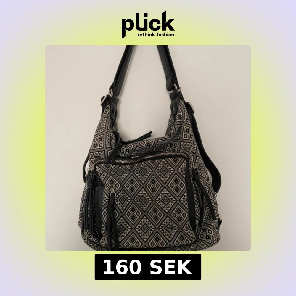 Snygg axelväska i svart och vitt med grafiskt rutmönster. Väskan har flera dragkedjor, tofsdetaljer och breda axelband i svart skinnimitation. Perfekt för dig som vill ha en unik och rymlig väska med coola detaljer.