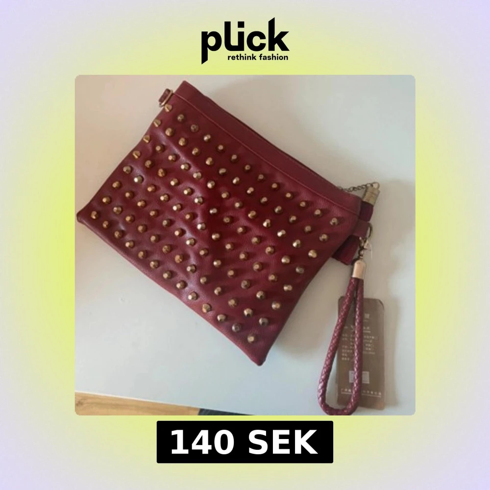 Snygg röd kuvertväska med guldfärgade nitar och matchande tofs. Väskan har avtagbar axelrem och handledsrem i flätad stil. Tillverkad i syntetmaterial med dragkedja upptill. Perfekt accessoar för att lyfta din outfit.