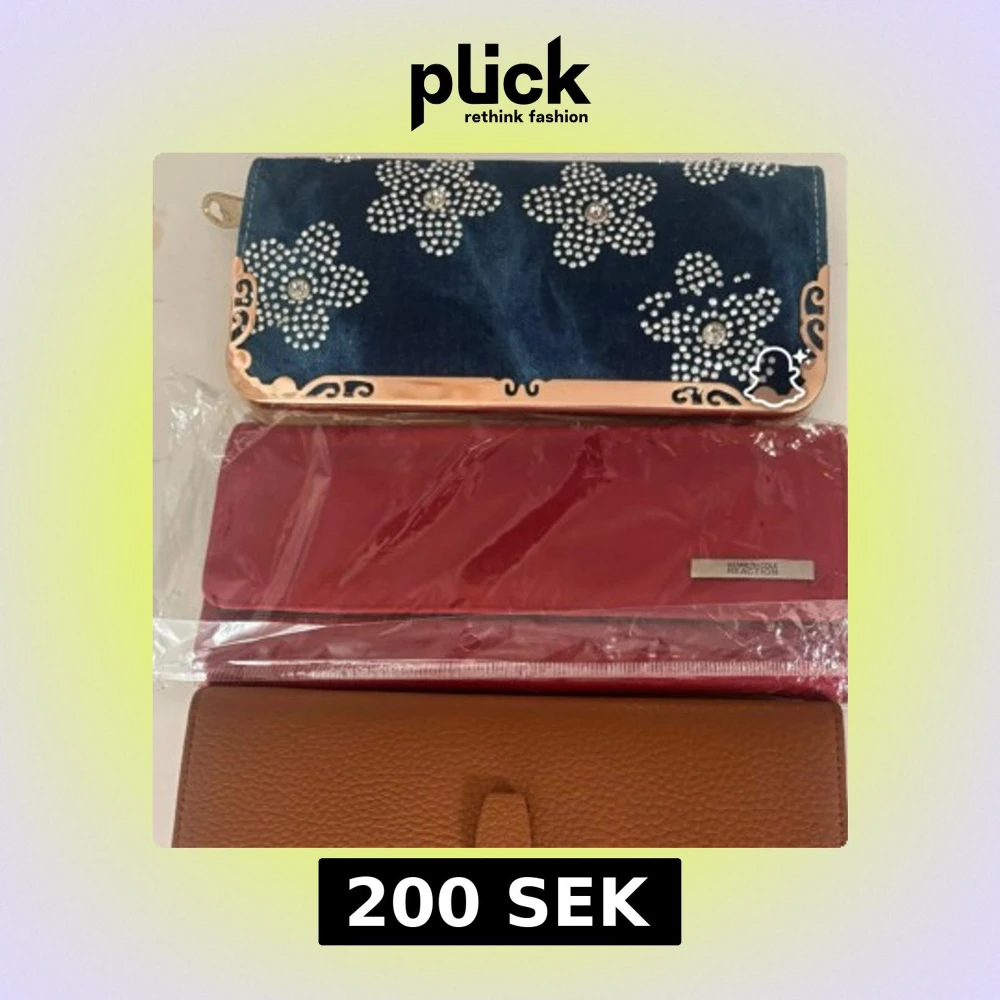 Säljer fyra plånböcker: en blå med blommiga strasstenar och gulddetaljer, en röd från Kenneth Cole Reaction, en brun i skinnimitation med guldlås och en rödsvart plånbok med leopardmönster. Perfekt för dig som vill variera din stil!