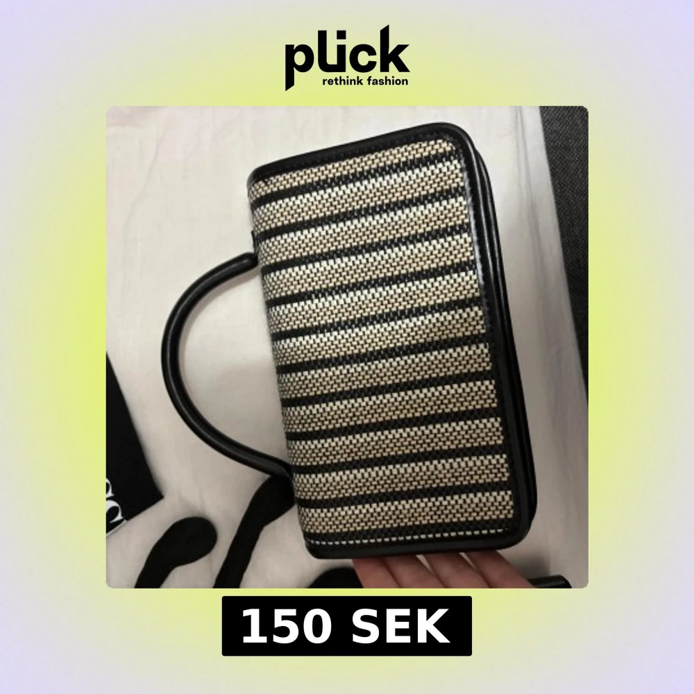 Snygg handväska med ett stilrent randigt mönster i svart och beige. Väskan har en praktisk handtag och är perfekt för att bära dina nödvändigheter. Den har en elegant design som passar till många olika tillfällen. Aldrig använd