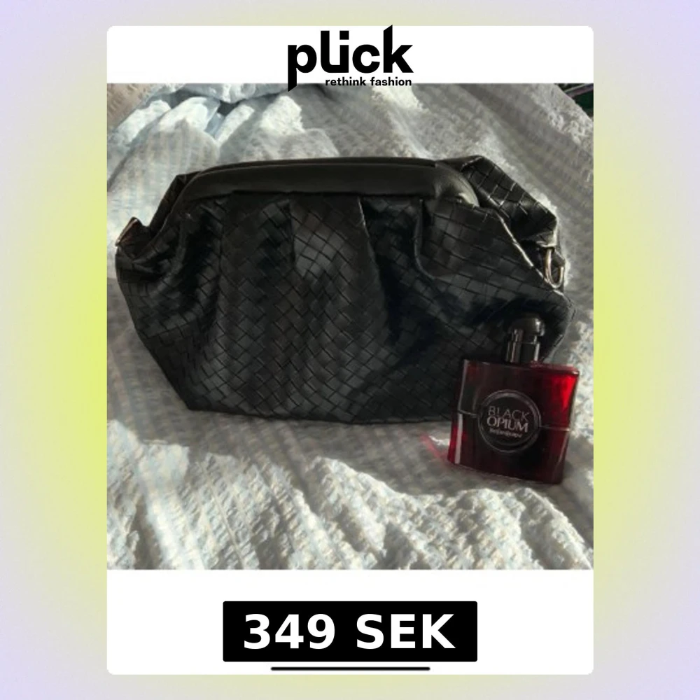 Säljer en svart handväska med snygg flätad design och metallspänne upptill. Väskan är gjord i skinn och har ett rymligt fack som passar perfekt för smink och småsaker. Stilren och enkel att matcha med olika outfits.