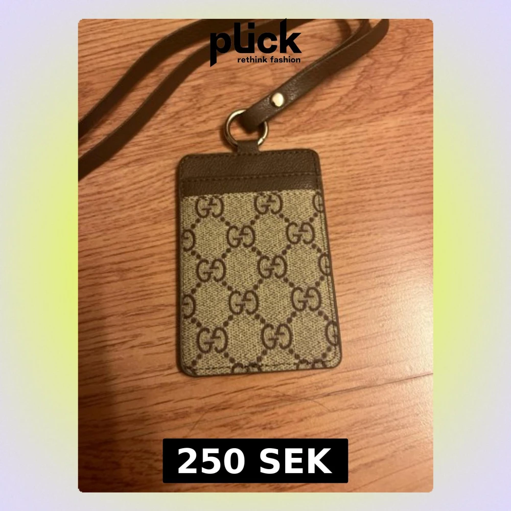 Snygg beige och brun plånbok med klassiskt GG-mönster. Har fönster för ID-kort och en praktisk rem att hänga runt halsen. Tillverkad i skinn och canvas, perfekt för att hålla koll på korten med stil.