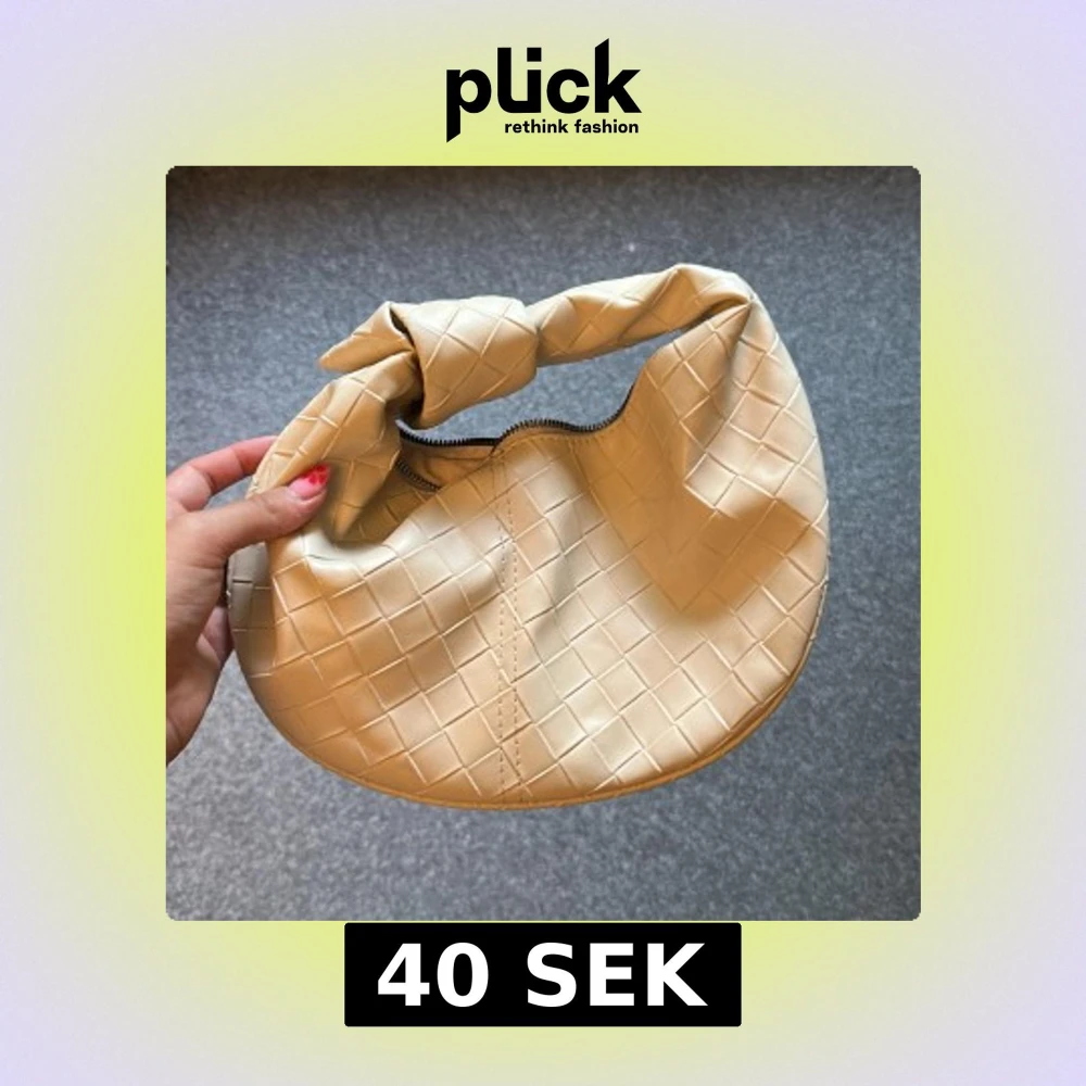 Säljer en beige axelväska i syntetmaterial med rutmönstrad yta. Väskan har en rund form, en cool knutdetalj på handtaget och stängs med dragkedja. Perfekt storlek för det viktigaste och ger en trendig vibe till din outfit.