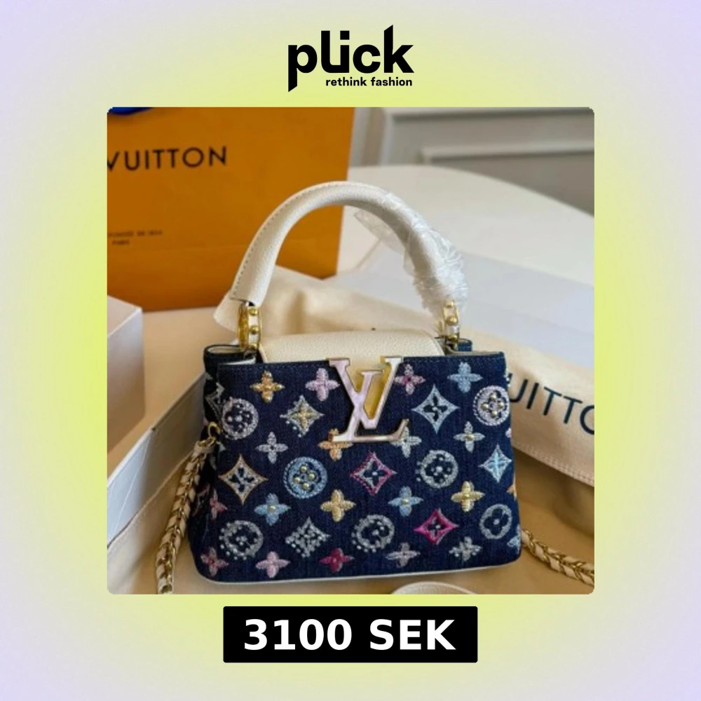 Snygg handväska från Louis Vuitton med broderade monogram i pastellfärger på mörkblått och svart tyg. Väskan har en metallkedja, stort LV-emblem framtill och handtag i skinn. Perfekt för dig som vill sticka ut med lyxig design och coola detaljer.