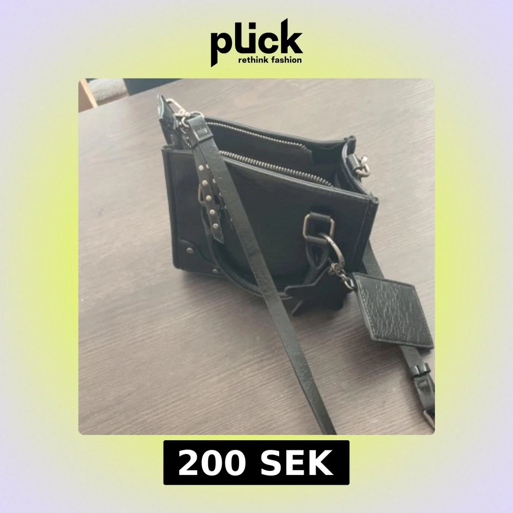 Snygg svart axelväska i skinn med justerbar axelrem och coola silverdetaljer. Väskan har flera fack med dragkedja och en dekorativ tag på sidan. Perfekt för att bära dina viktigaste grejer och ge outfiten en edgy touch.