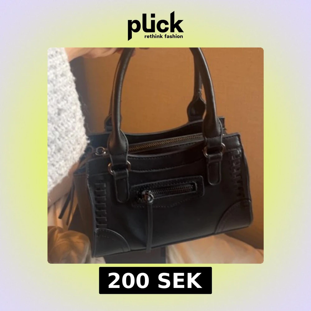Snygg svart handväska i skinnimitation med två stadiga handtag och dekorativa sömmar. Väskan har en dragkedja upptill och en mindre ficka med dragkedja framtill, perfekt för småprylar. Stilren och enkel design som passar till många outfits.