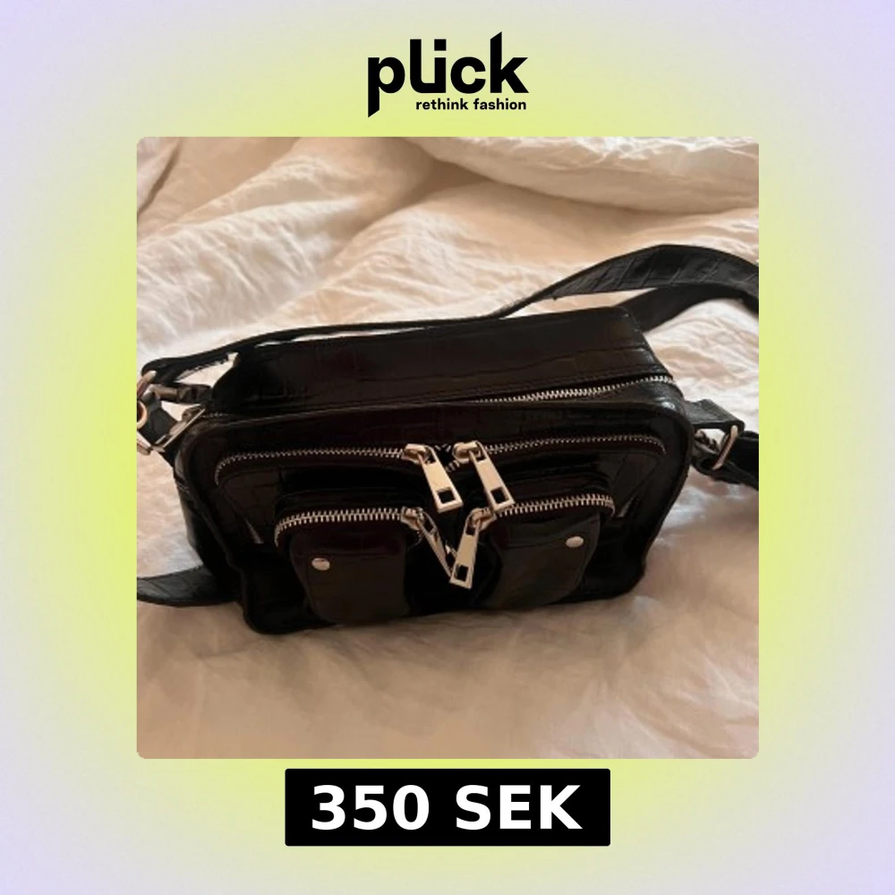 Cool svart axelväska med croco-mönster och flera silvriga dragkedjor framtill. Väskan har justerbar rem med nitar och praktiska fack för småsaker. Perfekt för dig som gillar edgy detaljer och vill ha ordning på grejerna.