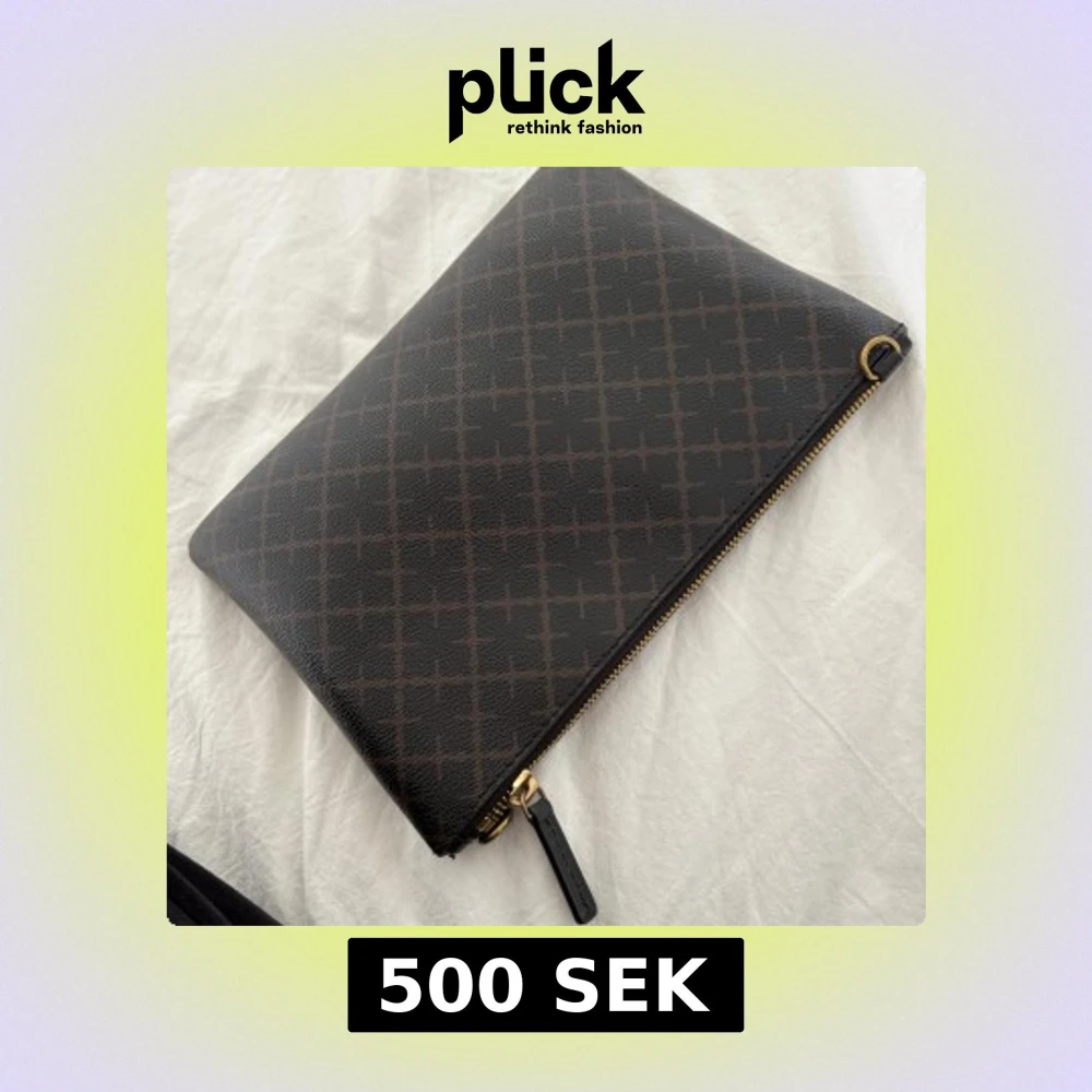 Säljer en stilren kuvertväska i svart och brunt med diskret rutigt mönster. Väskan har guldfärgade detaljer och dragkedja upptill. Pris kan diskuteras vid snabb affär.